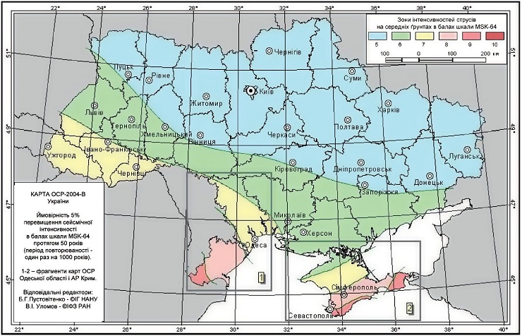Згідно з картою, якою користуються інженери при розрахунку конструкцій будинків і споруд, нові будинки в Києві витримають землетрус у п’ять балів, Одесі – сім балів, Львові – шість балів. Водночас можуть не витримати старі та аварійні будівлі.