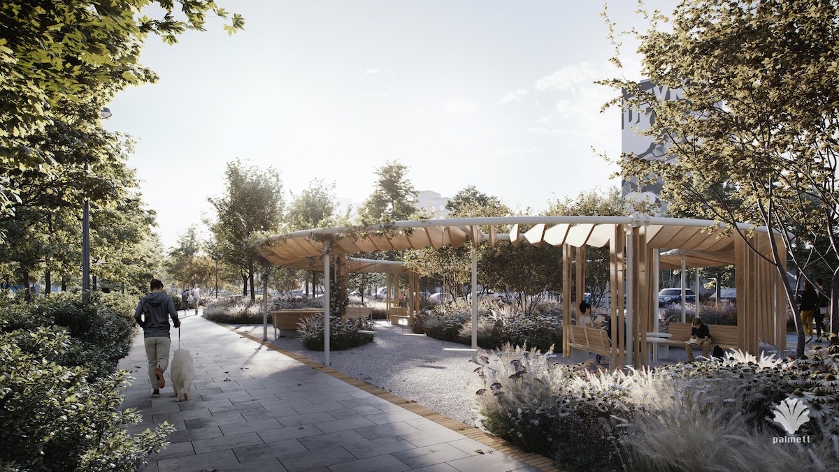 Головним елементом парку стане променада. Тут також створять дерев’яну перголу, дощовий сад, дитячий майданчик, сухий фонтан, гойдалки та лави, столи для пікніків.