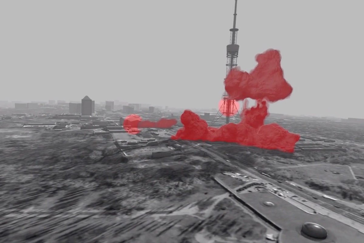 Авіаудар по київській телевежі першого березня 2022 року. Скриншот із розслідування Forensic Architecture та Центру просторових технологій
