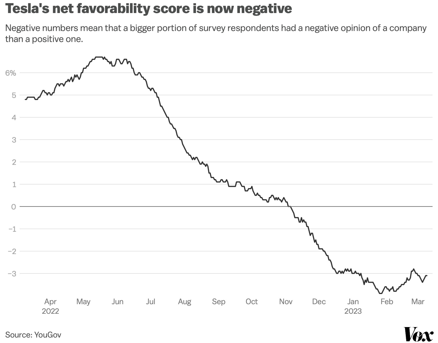 Водночас бачимо, що продажі почали падати з минулої весни, коли Маск заявив, що планує придбати Twitter, а потім кілька місяців відмовлявся це робити, доки зрештою не придбав компанію у листопаді. Тоді в листопаді відбулося відчутне падіння, і загальна позитивна оцінка Tesla стала негативною — тобто більше людей оцінювали її негативно, ніж позитивно.