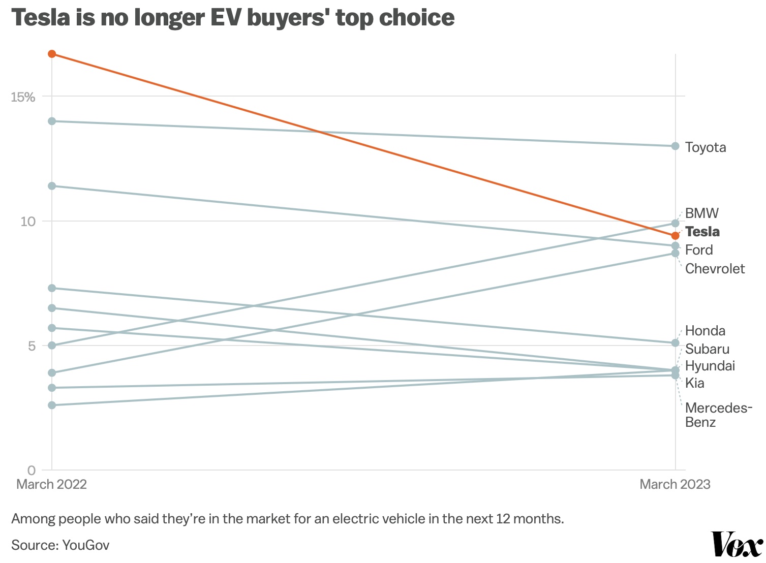 Частка продажів Tesla на американському ринку впала з позаторішніх 78% до 58% у четвертому кварталі 2022-го. Дані YouGov свідчать, що головним чинником для покупців є ціна, а тесли ніколи не були дешевими. Також на рішення впливають міркування безпеки — тут Tesla також мала проблеми останнім часом.