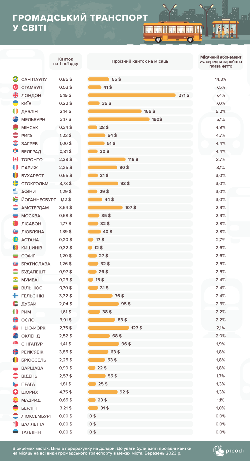 Київ посів четверте місце серед 45 мегаполісів світу за співвідношенням вартості місячного проїзного на громадський транспорт і середньою зарплатою. Дослідження провела команда Picodi.com.