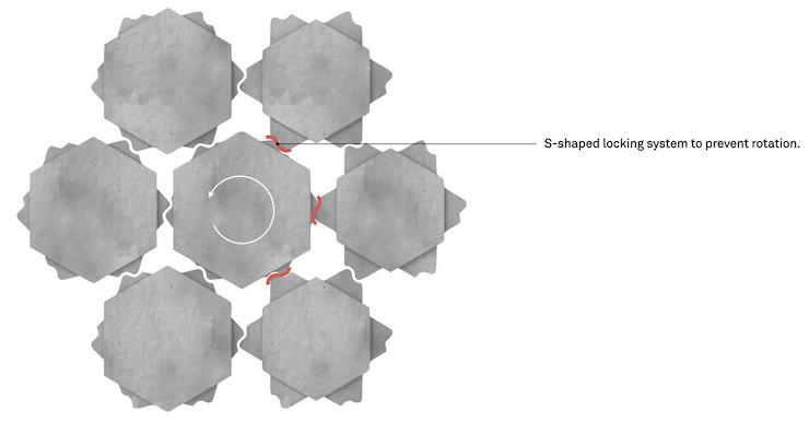 Вона складається з трьох видів шестикутних плиток: вони різного розміру та мають різні зубці, що дозволяє регулювати відстань між ними.