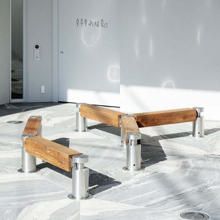 Завдяки конструкціям, що нагадують боларди, лави можна з’єднувати між собою в різних варіаціях. Є також розетки для заряджання гаджетів.