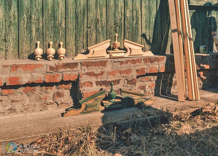 Вцілілі дерев’яні елементи фасаду залишать, а ті, що пошкоджені чи погано збереглися, замінять, зокрема, всі три пілястри, шість метрів карниза, віконниці. Після цього поґрунтують стіни й будуть зафарбовувати будинок вже у підготовлену кольорову схему.