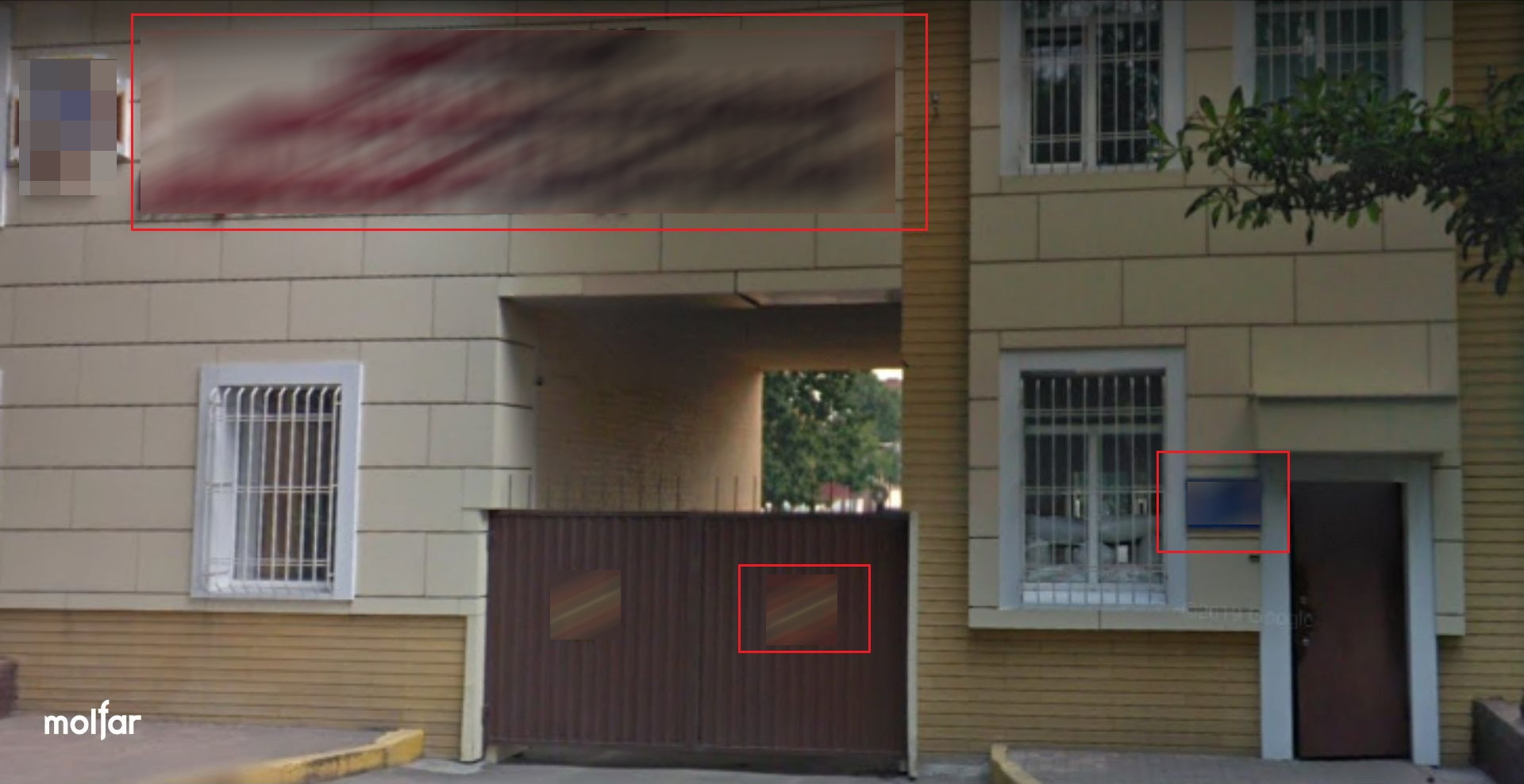 Специфічні позначки на будівлях, адреси будівель. Знаки можуть видати інформацію про дислокацію військових у будівлях.