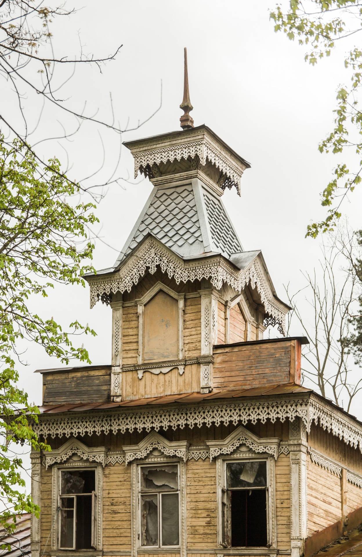 Перший поверх, мезонін і башта утворюють три яруси. Головний фасад асиметричний — підприємливий замовник поступився красою заради функціональності розташування приміщень.