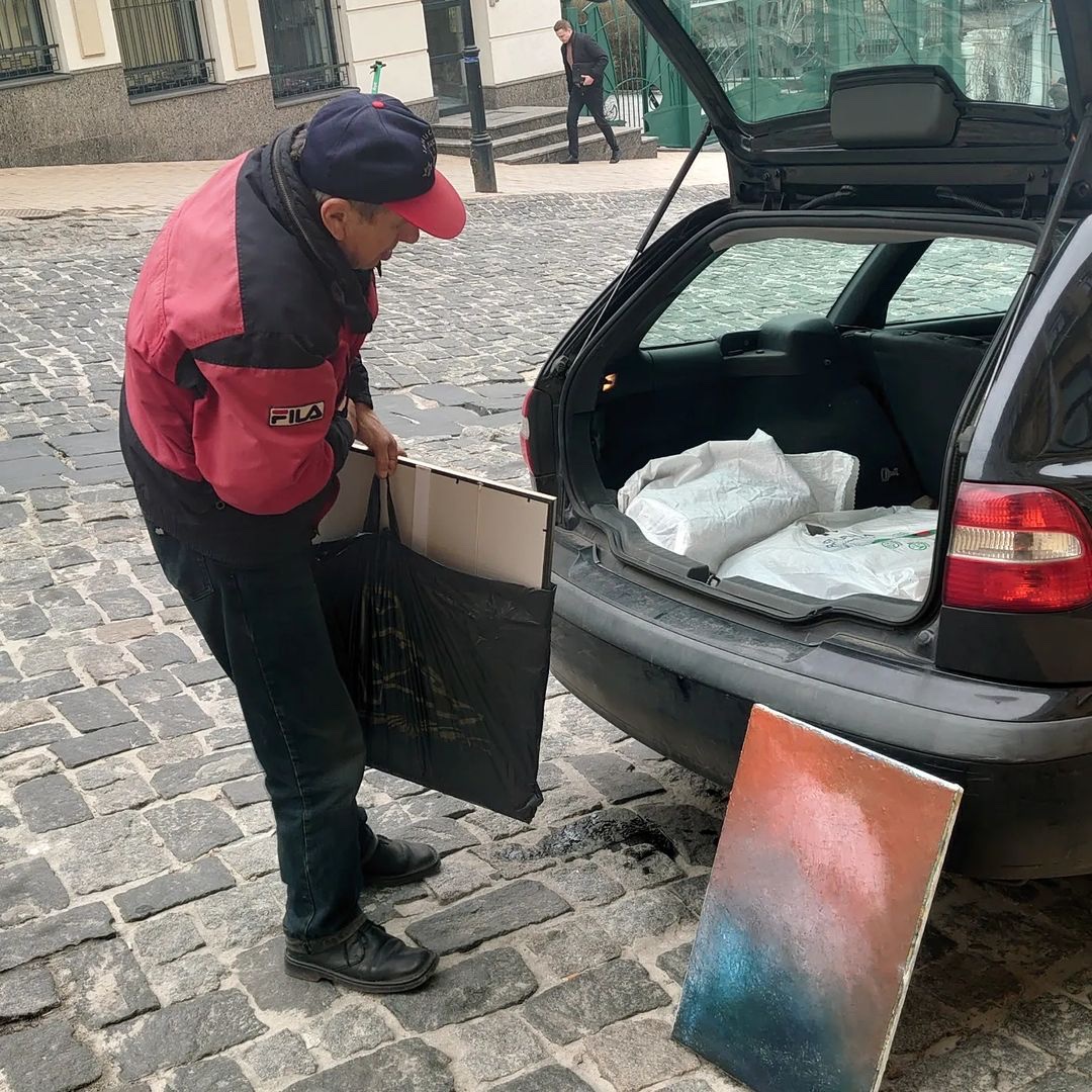 Наприкінці березня у соцмережах поширилися фото з подвір’я на вулиці Підвисоцького, яке прибирає 72-річний чоловік. Він розвісив свої картини на стіні сараю біля смітників.