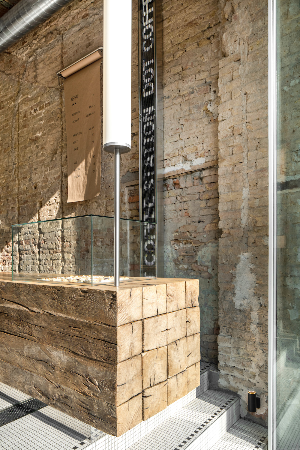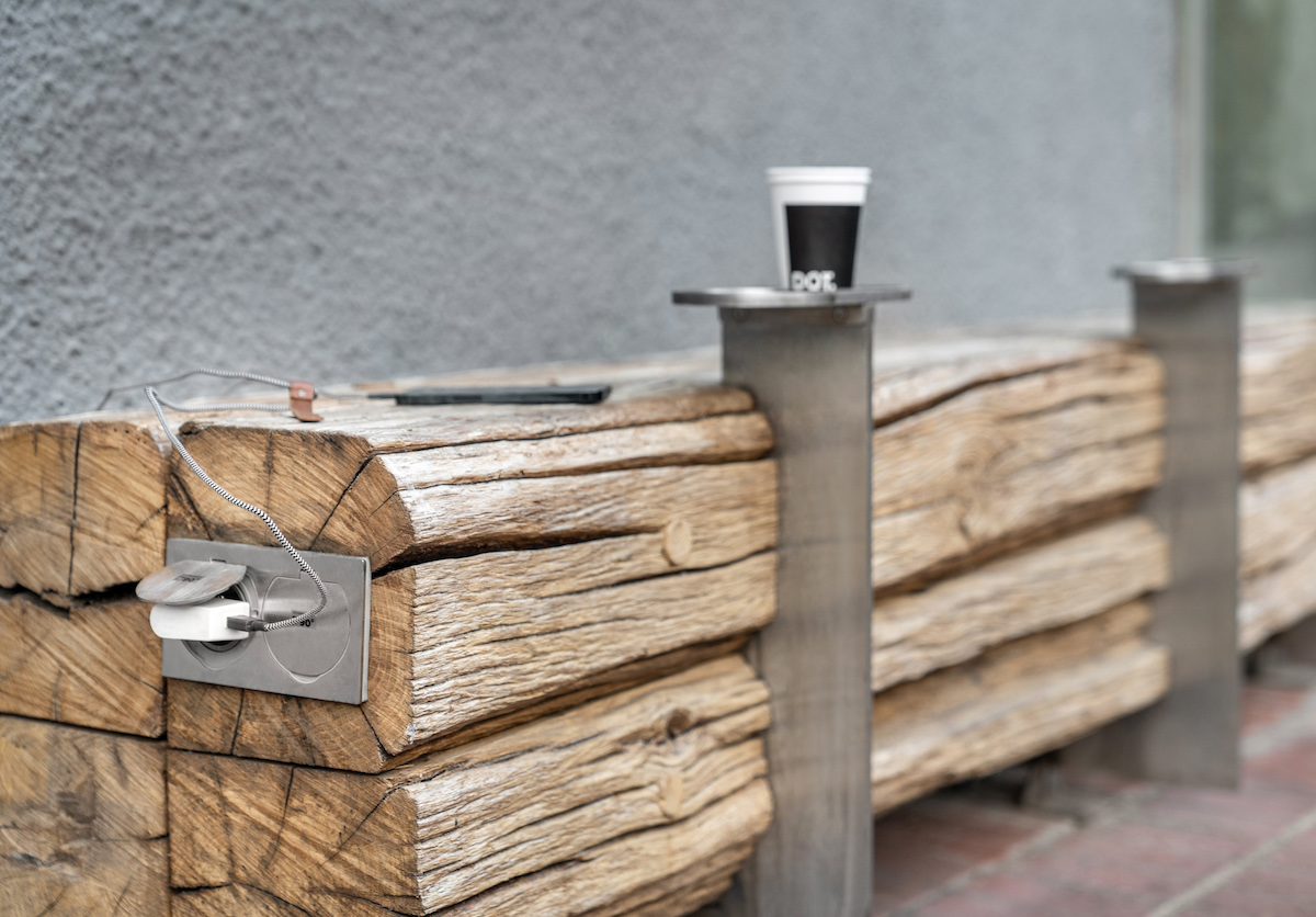 Деревина для барної стійки та лавок вздовж фасаду кав’ярні — це старі бруси, що були у вжитку багато десятиліть.