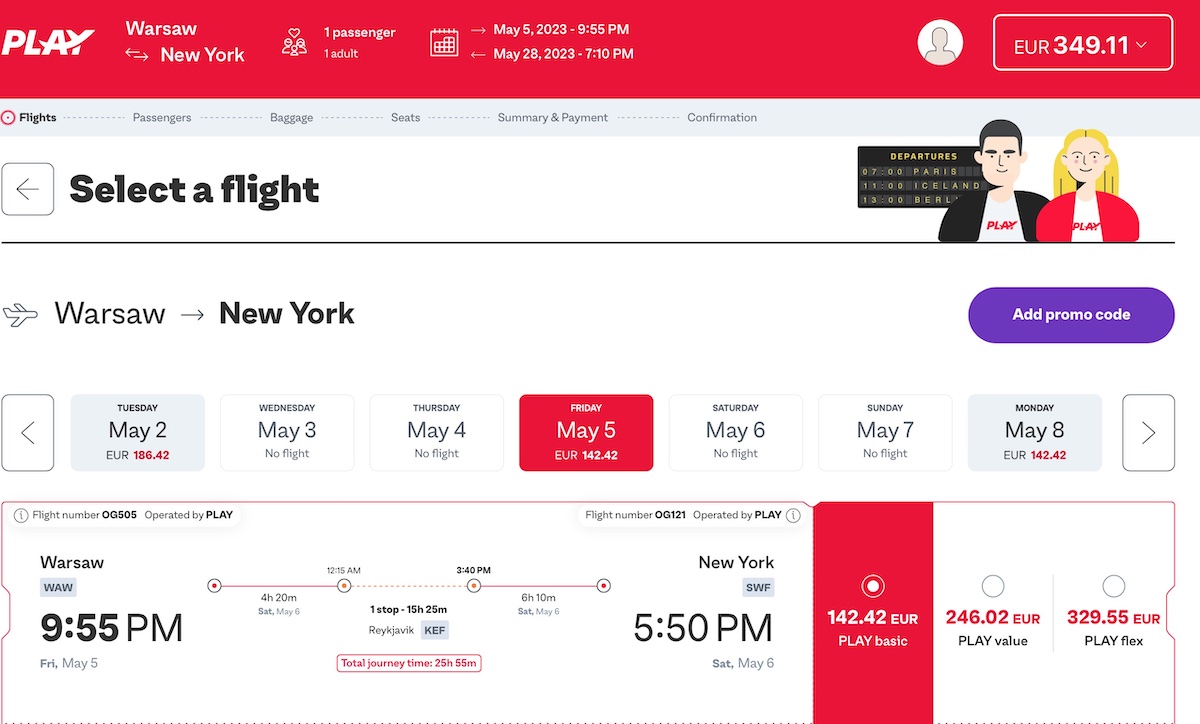 Зокрема, квитки на рейси з Варшави з пересадкою в Рейк’явіку, базі авіакомпанії, до Нью-Йорка, Бостона, Вашингтона і Торонто можна купити менш як за 400 євро в обидві сторони. Якщо купувати квиток в один бік, ціна починатиметься від 290 євро.