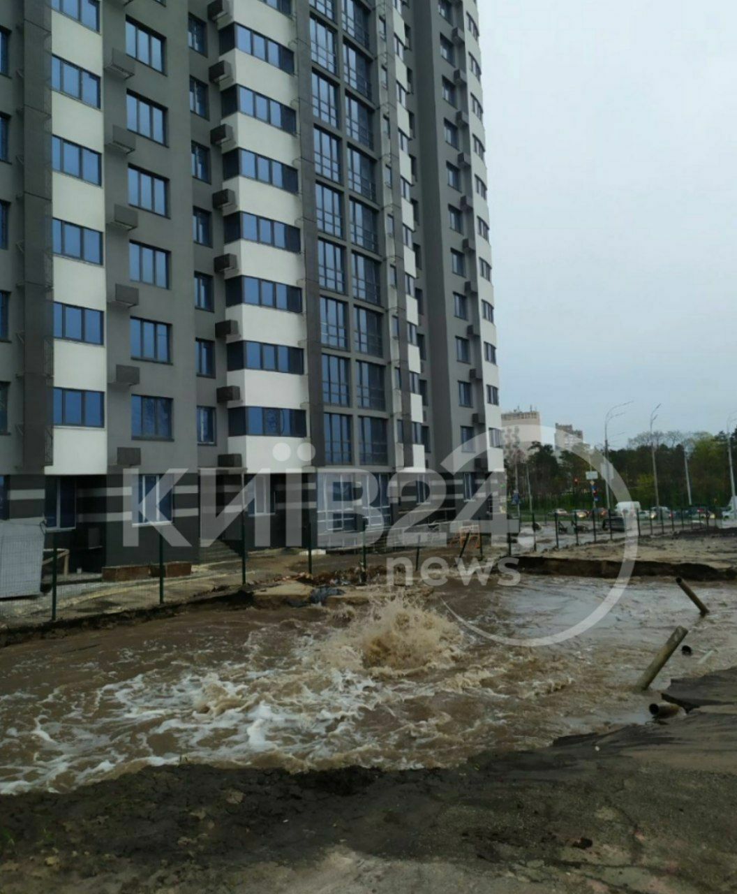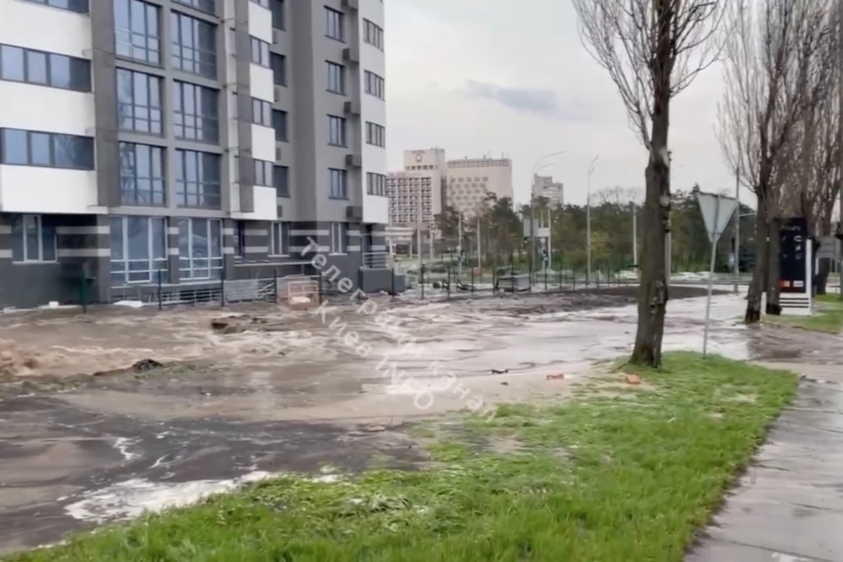 На ранковому відео телеканалу Київ видно, що у місці прориву все ще б’є гейзер, хоча на проїжджій частині вода зійшла.