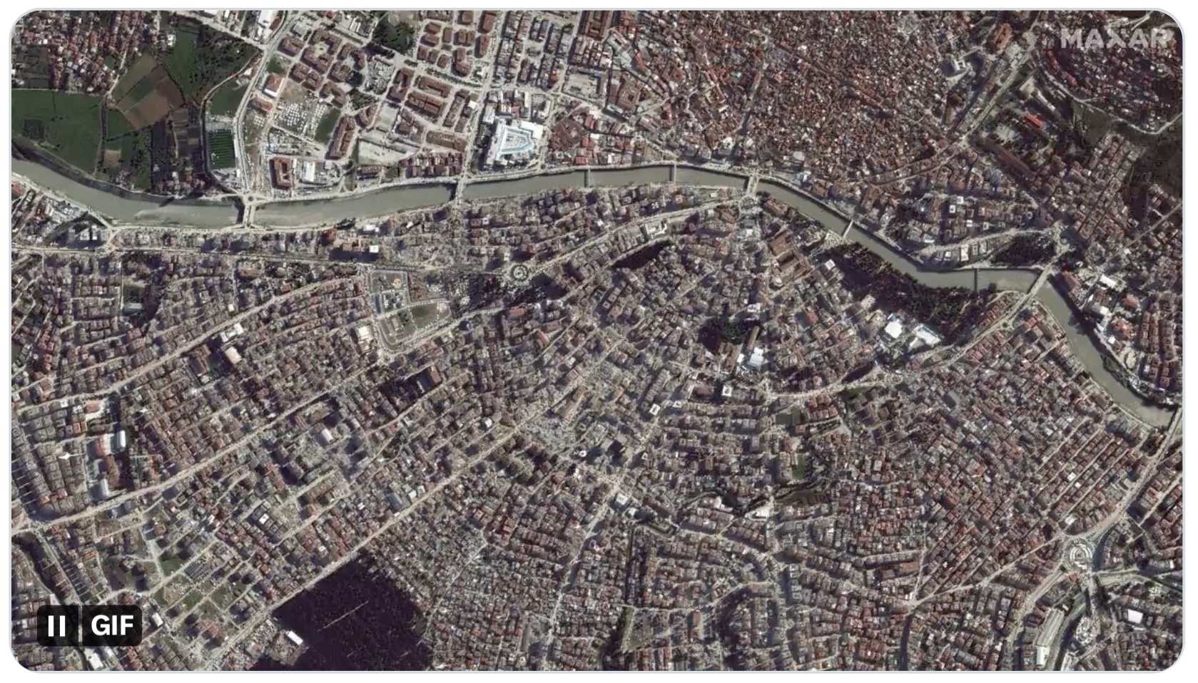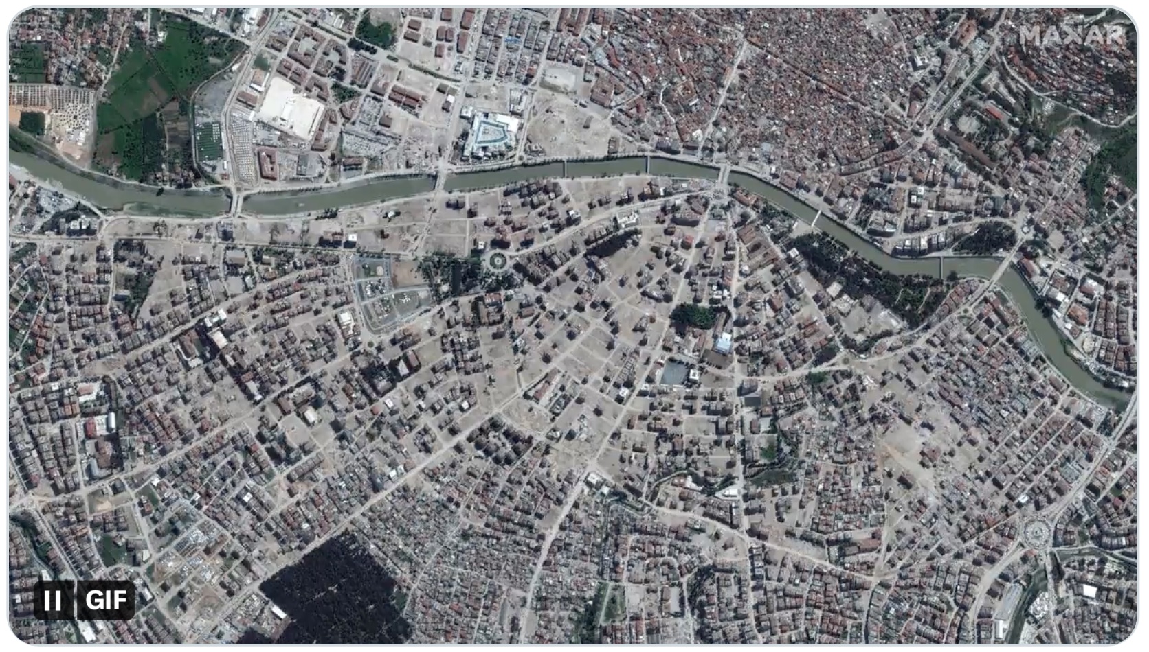 Ось так на супутникових знімках Maxar виглядає центр Антак’ї до катастрофи та після розчищення руїн: