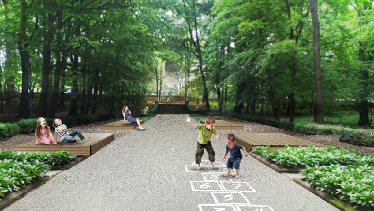 Архітектори пропонують створити майданчики для гри та відпочинку, які будуть розміщені рівномірно по всій території парку для зручної доступності зі входів та між собою, майданчики зі спортивними елементами для воркауту, зону для тренувань та вільного бігу собак.