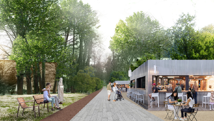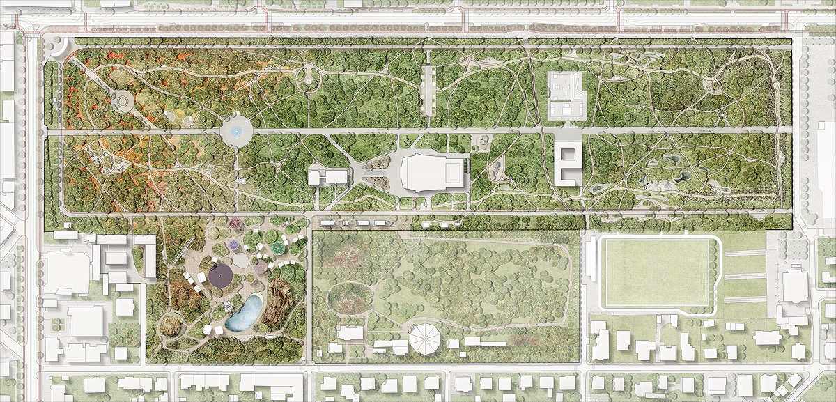 Архітектори пропонують максимально зберігати зелені насадження у парку та облаштовувати територію, орієнтуючись на рослинність. Головна ідея проєкту — садова алея — спрямована на знайомство відпочивальника з парком та веде його крізь зелень, оминаючи урбанізовані алеї та площі. На своєму шляху, відвідувачі проходять крізь різні ландшафтні та функціональні зони.