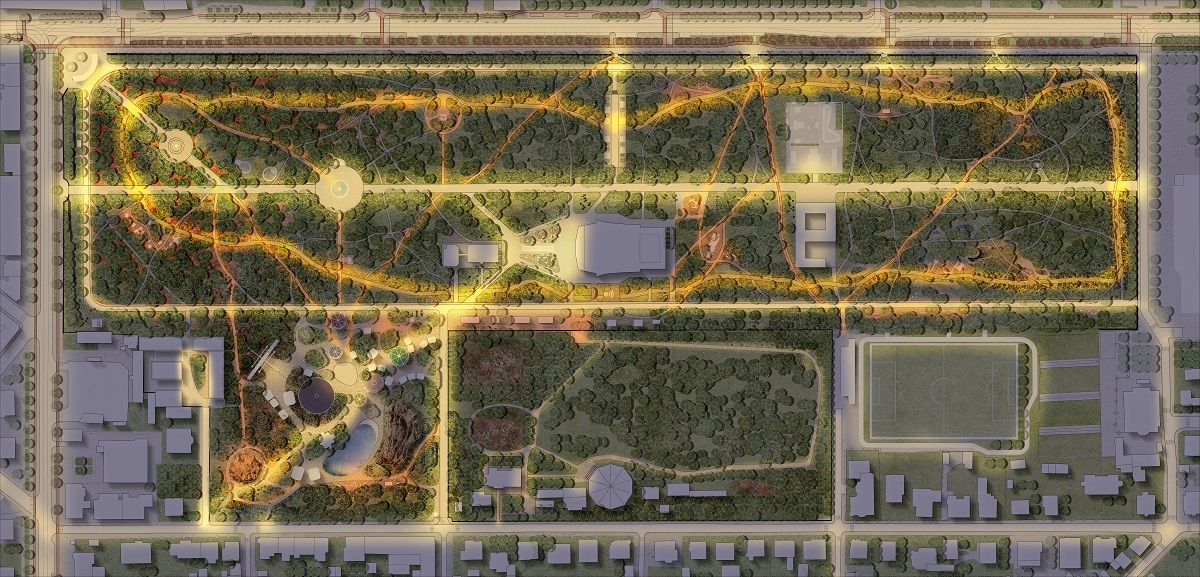 Освітлення складається з трьох шарів: верхнє загальне освітлення головної алеї та популярних майданчиків, комбіноване освітлення Садової алеї та транзитних шляхів та камерне освітлення низьких стовпчиків ліхтарів вздовж всіх прогулянкових доріжок парку.