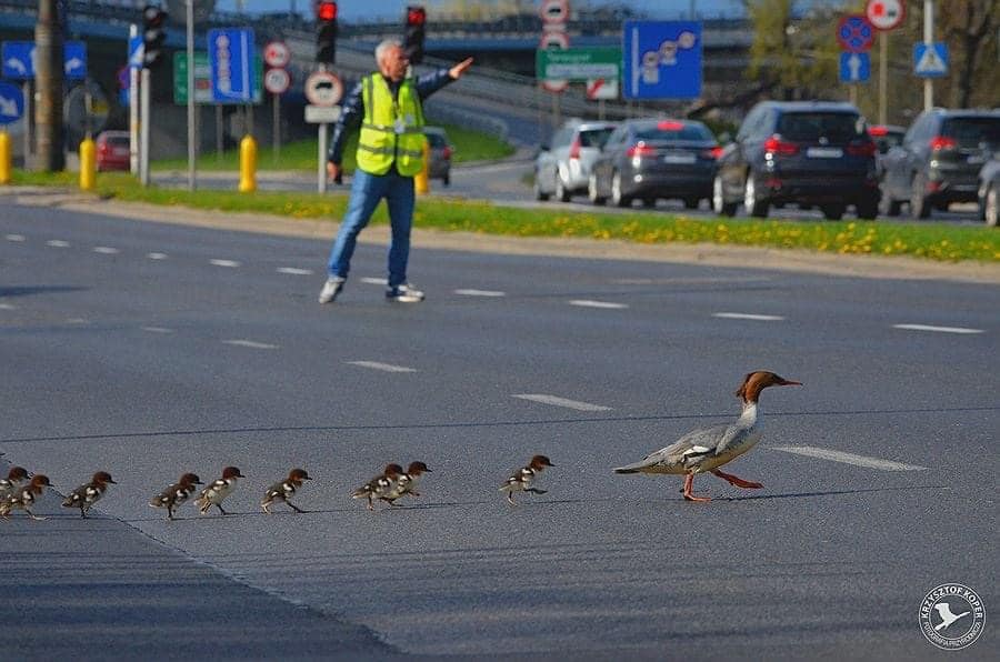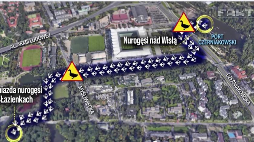 Мами з пташенятами переміщаються з парку Королівські Лазеньки до річки Вісли. Їхній маршрут пролягає через дві вулиці, зокрема шестисмугове шосе.