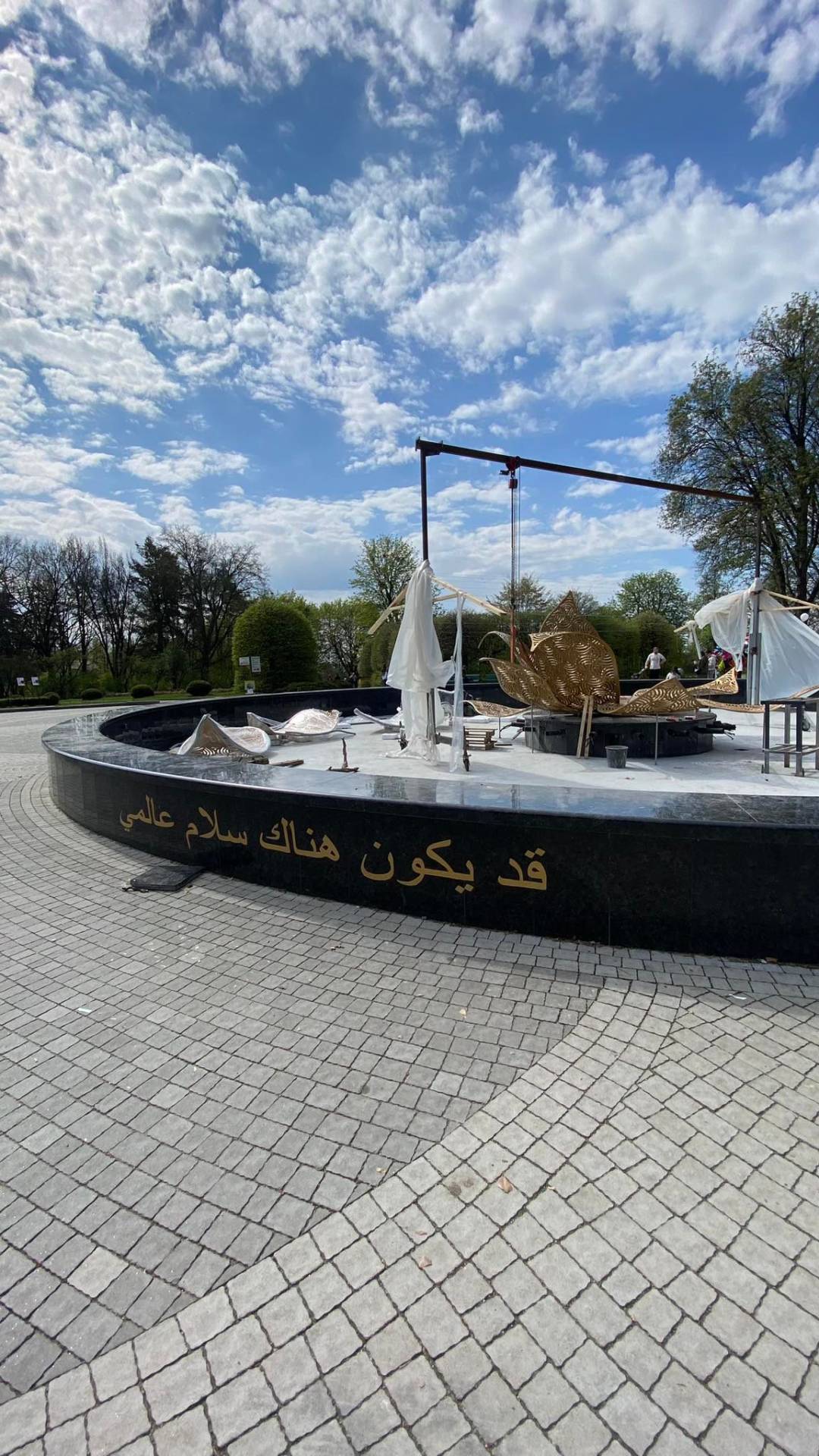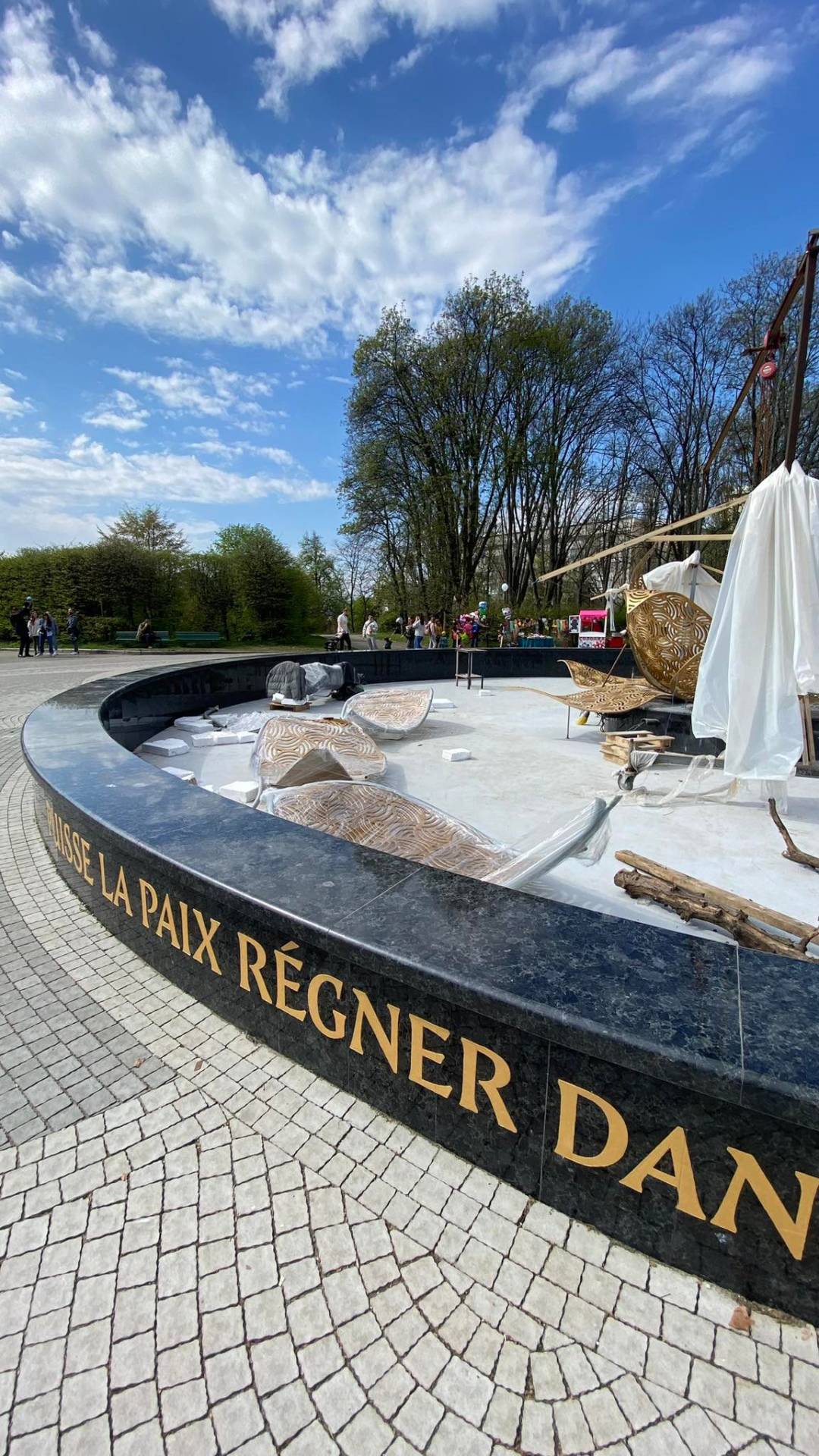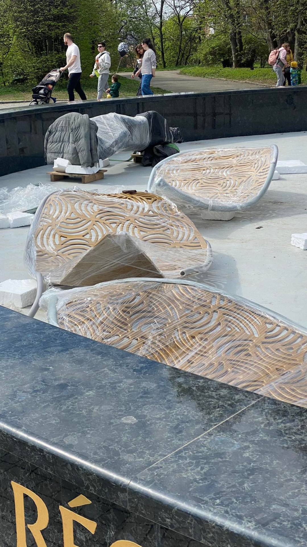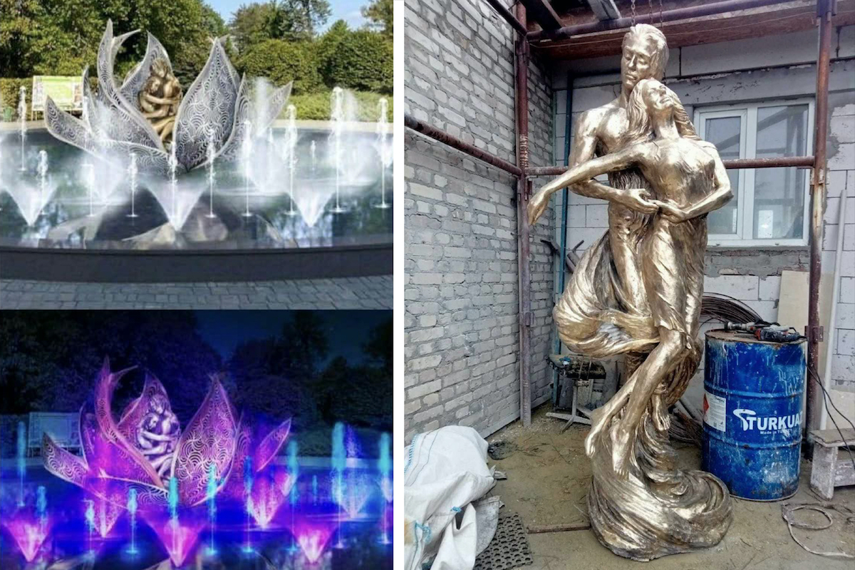 У київському Ботанічному саду імені Гришка оновлюють «центральний фонтан квітів» на вході. Посередині встановлюють композицію — яка, судячи з візуалізацій і фото, опублікованих Павлом Ботвіновським, зображатиме пару закоханих, що обіймаються серед велетенських пелюсток.