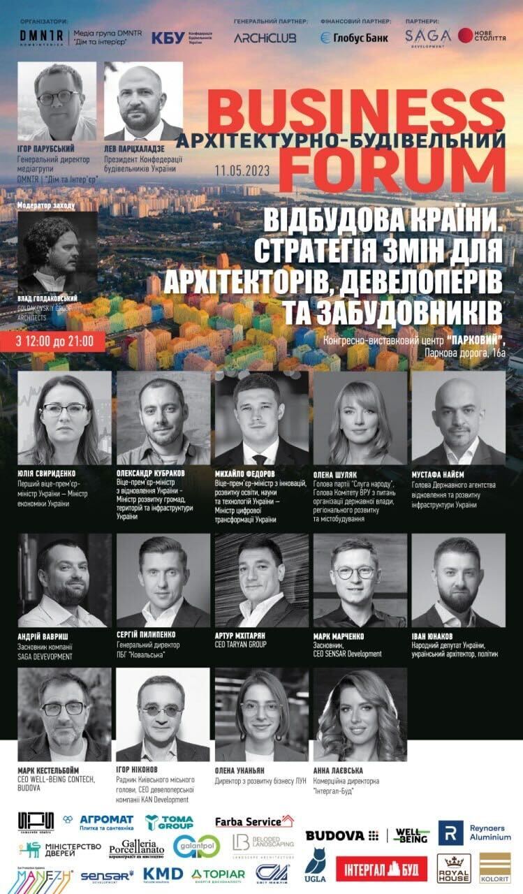 11 травня 2023 року у КВЦ “Парковий” у Києві, відбудеться Архітектурно-будівельний BUSINESS FORUM «Відбудова країни. Стратегія змін для архітекторів, девелоперів та забудовників».