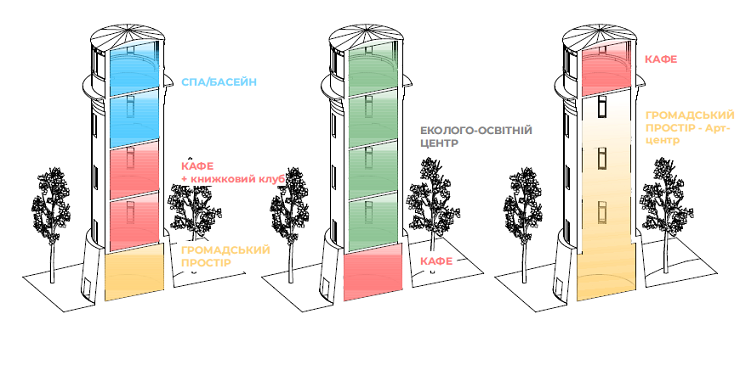 Команда пропонує три варіанти функціонального зонування вежі. Перший варіант: перший поверх відіграє роль наскрізного громадського простору та є прохідним. Кафе розташовано на двох поверхах вище. На верхніх двох рівнях пропонується розмістити СПА з басейном. Таким чином вежа стає багатофункціональною та залучає людей, які мають різні запити.