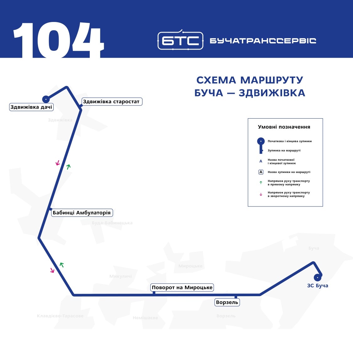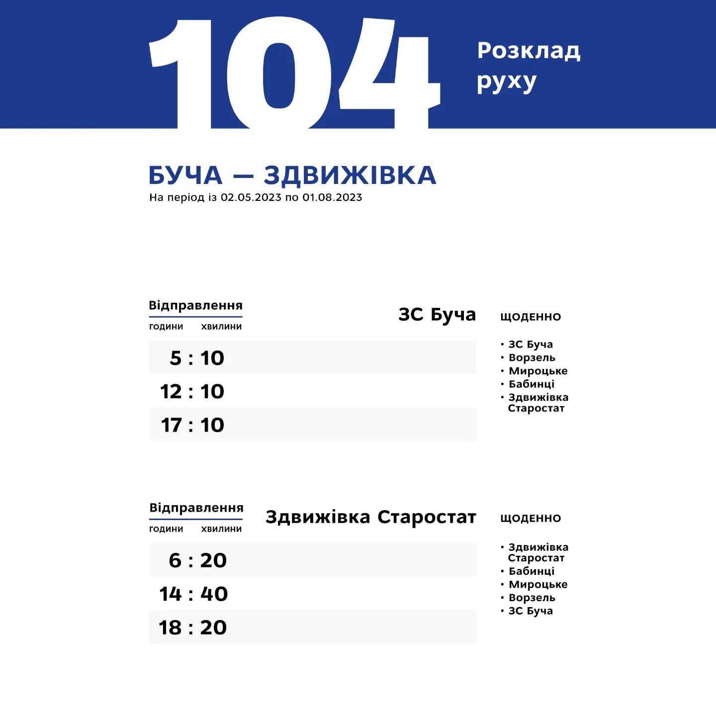 Тарифи на маршруті 104: Буча–Ворзель — 11 гривень; Буча–Бабинці — 27 гривень, Буча-Здвижівка — 34 гривні. Усі тарифи — за посиланням.