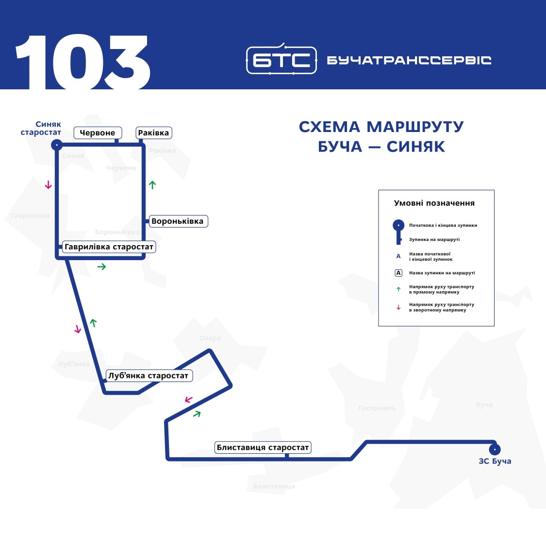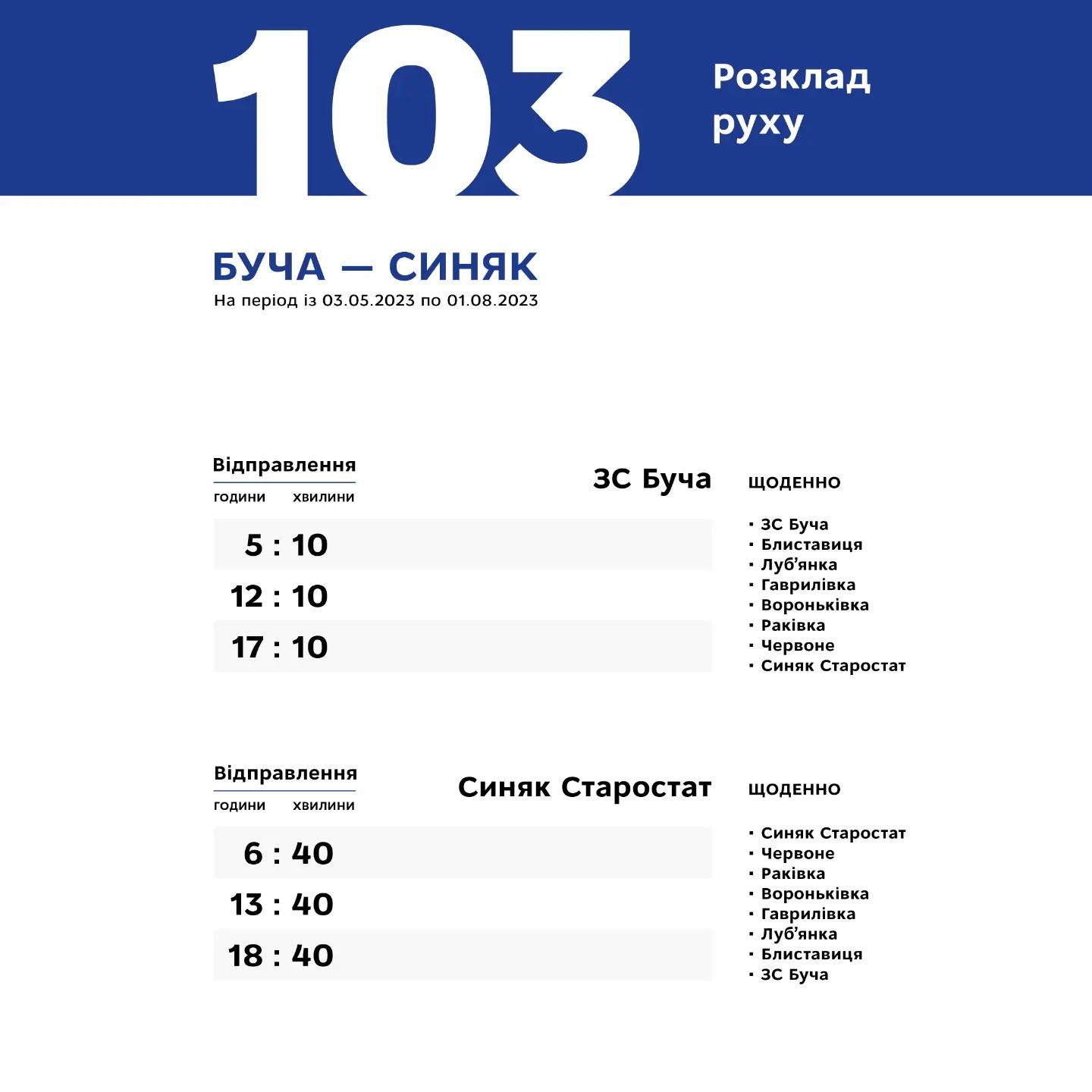 Тарифи на маршруті 103: Буча–Синяк — 34 гривні; Буча–Блиставиця — 11 гривень.