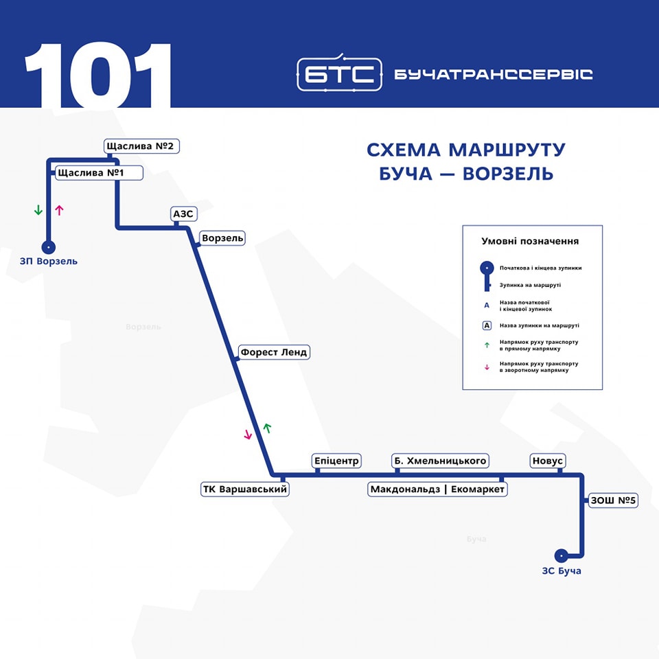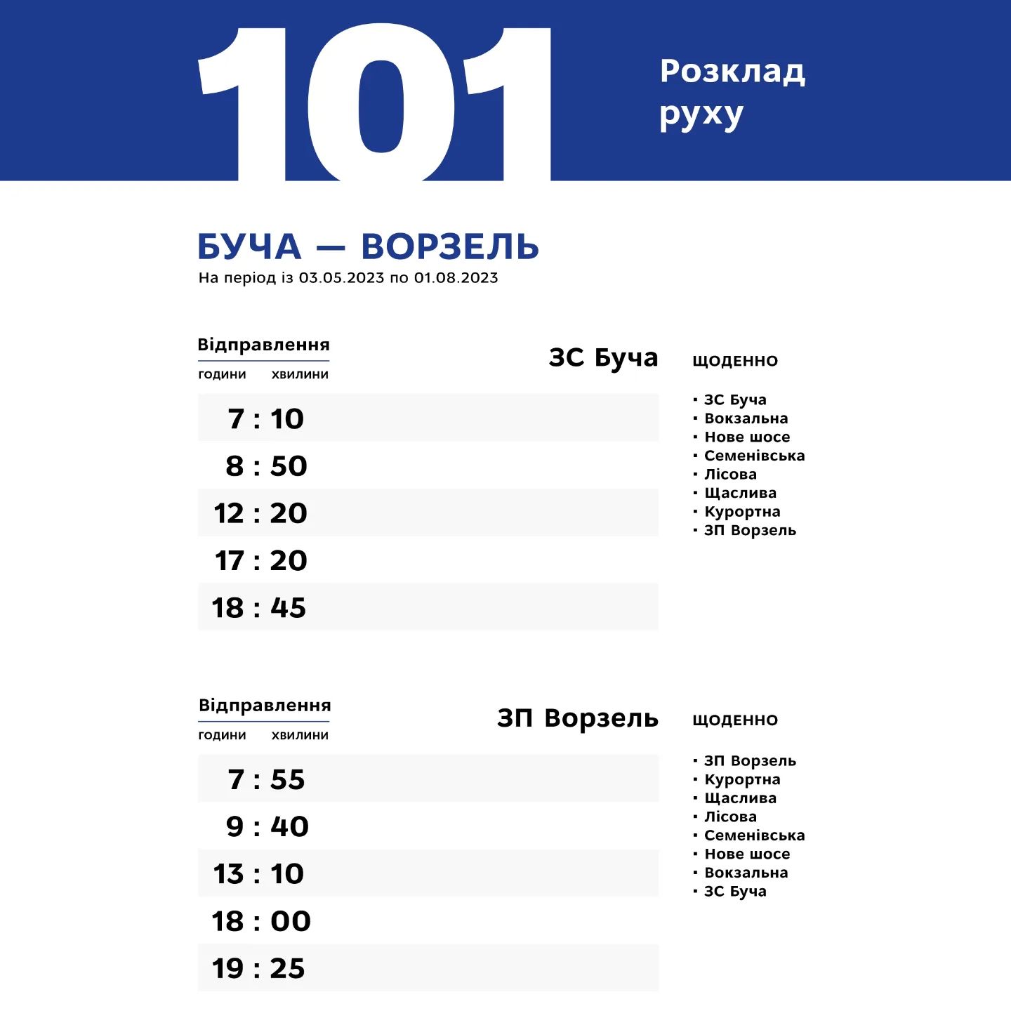 Наразі працюють чотири маршрути, які сполучають Бучу з Ворзелем (№101, 102), селом Синяк (№103) та Здвижівкою (№104). Графік передбачає лише три-чотири рейси на день в кожен бік.