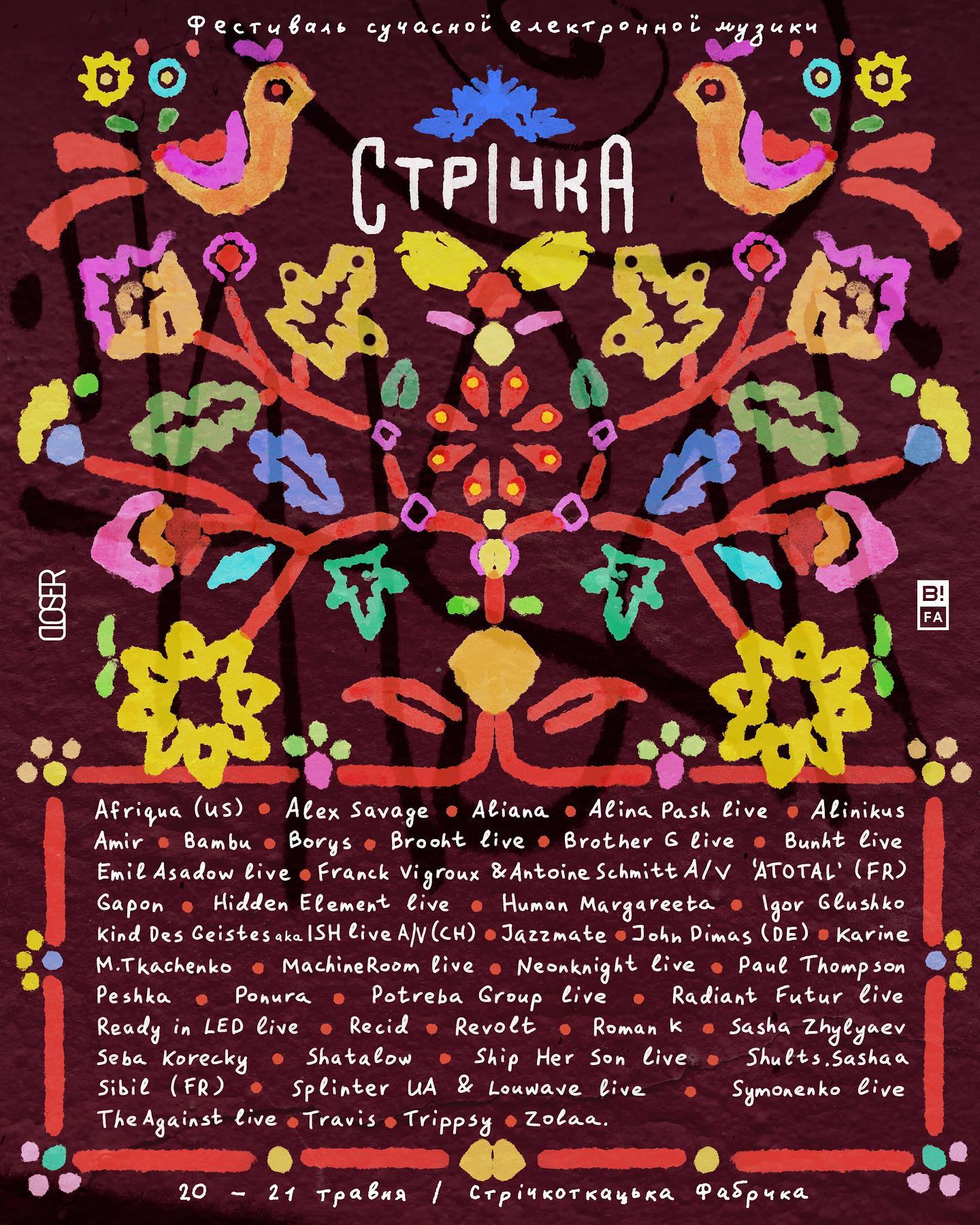 Фестиваль електронної музики «Стрічка» оголосив список виконавців, які виступатимуть 20–21 травня на території Стрічкоткацької фабрики, на вулиці Нижньоюрківській, 31 на київському Подолі.