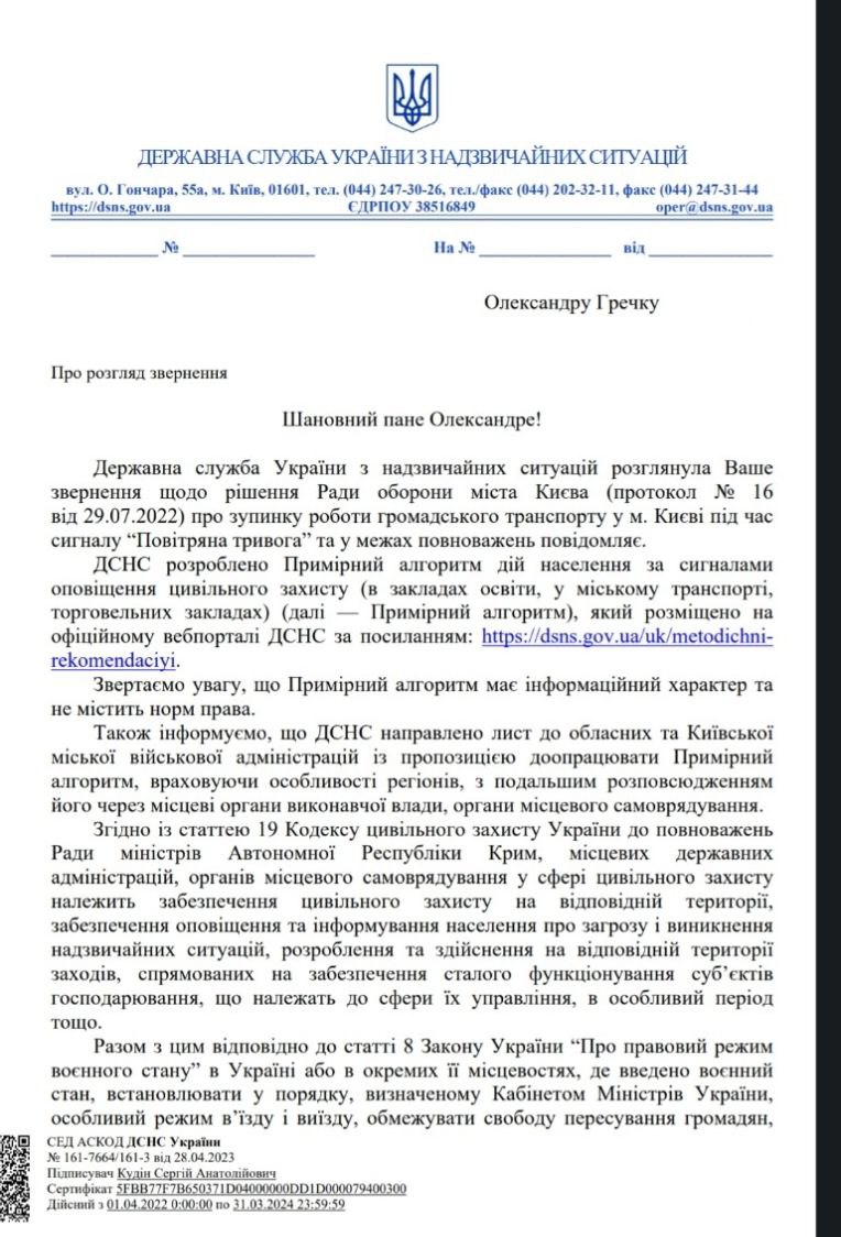 Водночас «Пасажирам Києва» повідомили в ДСНС, що служба влітку минулого року розробила примірний алгоритм дій населення за сигналами оповіщення цивільного захисту (в закладах освіти, у міському транспорті, торговельних закладах), який розміщено на офіційному вебпорталі служби. У ДСНС підкреслили, що примірний алгоритм має інформаційний характер та не містить норм права.