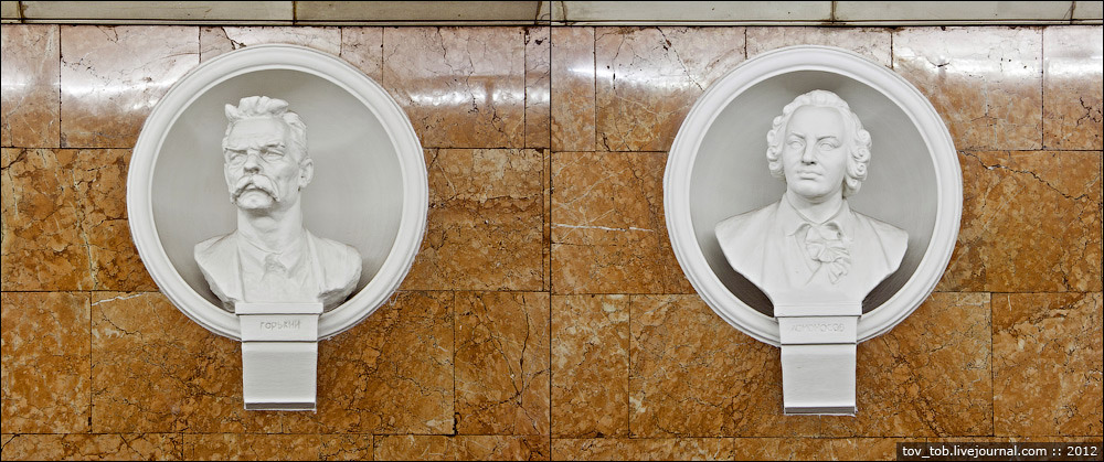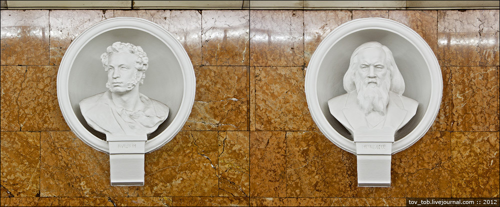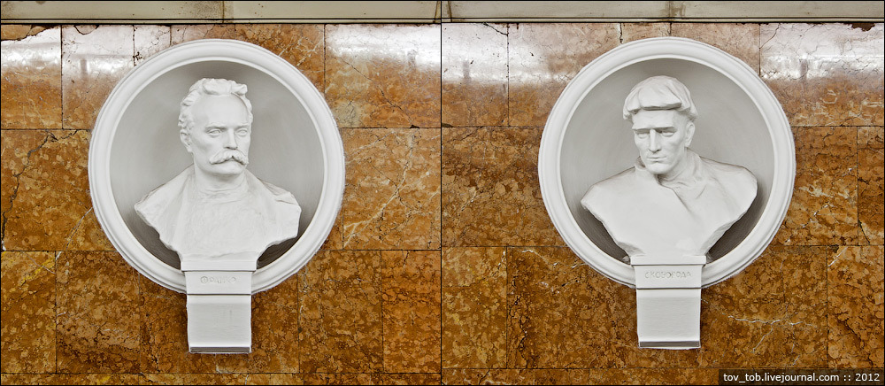 Бюсти українських і російських письменників та вчених є частиною оздоблення станції з 1960 року. Торік, після російського вторгнення, погруддя Пушкіна, Горького, Ломоносова та Менделеєва закрили дерев’яними боксами. Їх планують демонтувати та замінити на українських діячів.