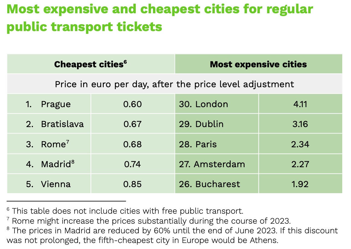 Повна вартість проїзного абонементу. Для такої країни, як Німеччина, доступними можуть вважатися тарифи, які передбачають не більш як один євро для поїздок по країні й не більш як 0,50 євро по місту. В аналізі враховували паритет купівельної спроможності: так, витрати в один євро в Італії еквівалентні 0,49 євро в Румунії та 1,72 євро у Швейцарії. У таблиці нижче наведено топ-5 найдешевших і топ-5 найдорожчих міст із таким перерахунком: