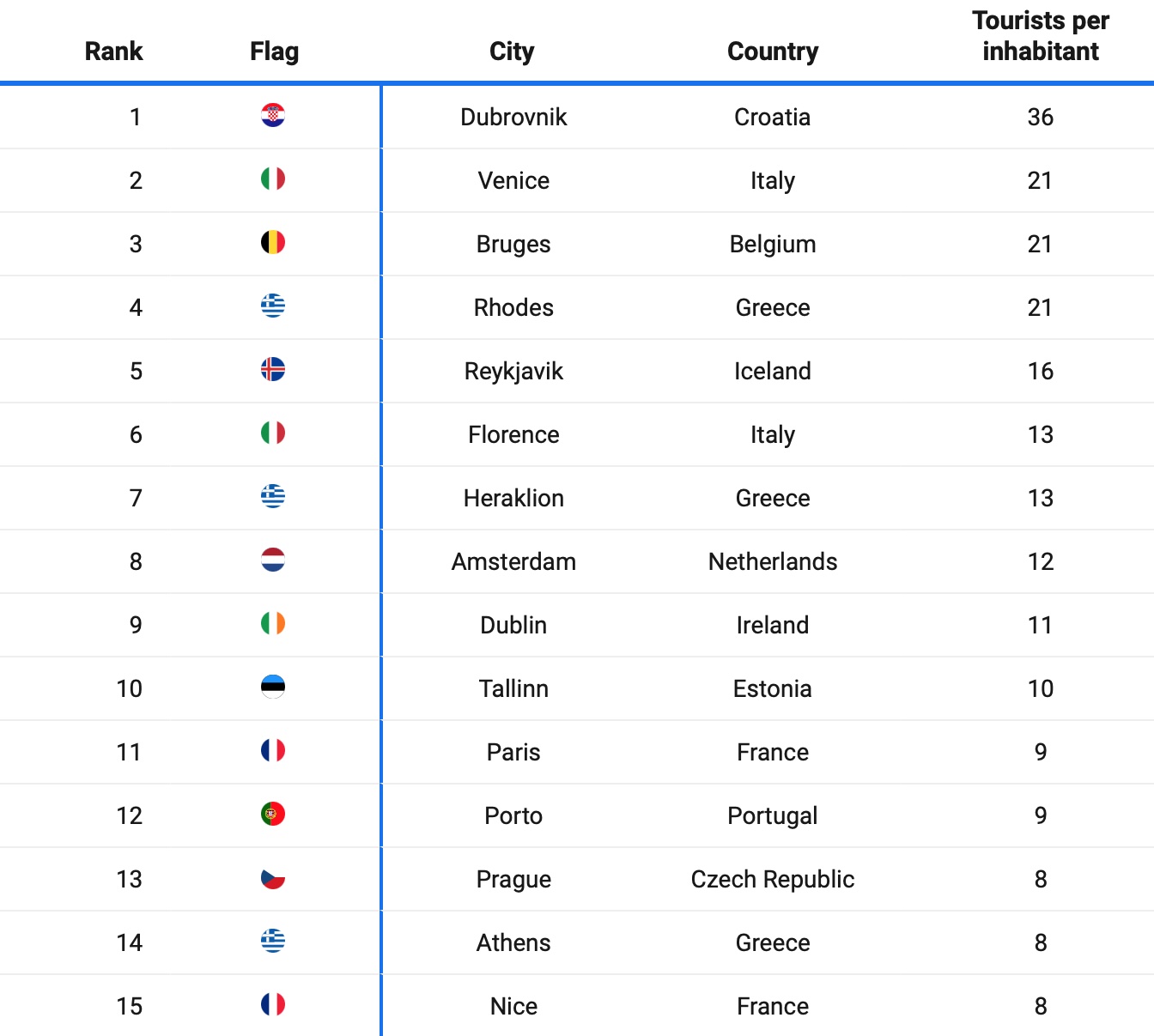 Так, на кожного жителя хорватського Дубровника припадає 36 туристів — адже «Перлина Адріатики» поєднує приголомшливу красу старовинного міста, гір та теплого моря. У 2017 році ЮНЕСКО навіть розглядала варіант виключити місто зі списку світової спадщини. Найбільші натовпи тут у липні та серпні. Holidu радить відвідувати Дубровник принаймні з середини вересня до середини жовтня.