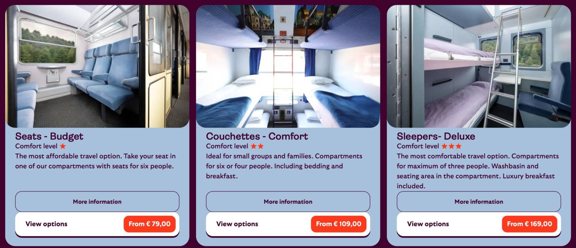 На маршруті Брюссель-Берлін найдешевше коштує сидяче місце у шестимісному купе (від 79 євро). Ліжко у шестимісному купе (по три полиці з кожного боку) коштує 109 євро, у чотиримісному — 149 євро, окреме купе для однієї людини — 549 євро. У вартість квитка входить сніданок. Є також делюкс-купе на трьох, двох та одного пасажира (від 179 євро) — місця в таких купе вже розпродані на всі дати до липня. Ліжко в жіночому тримісному делюкс-купе коштує 169 євро.
