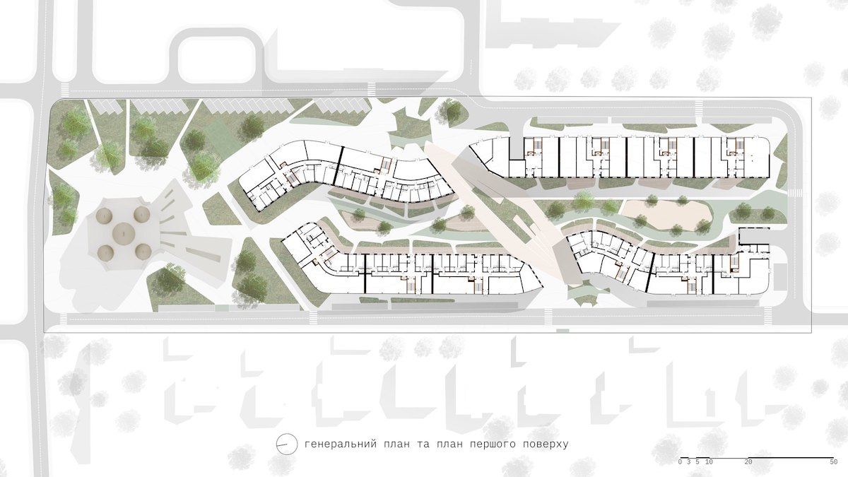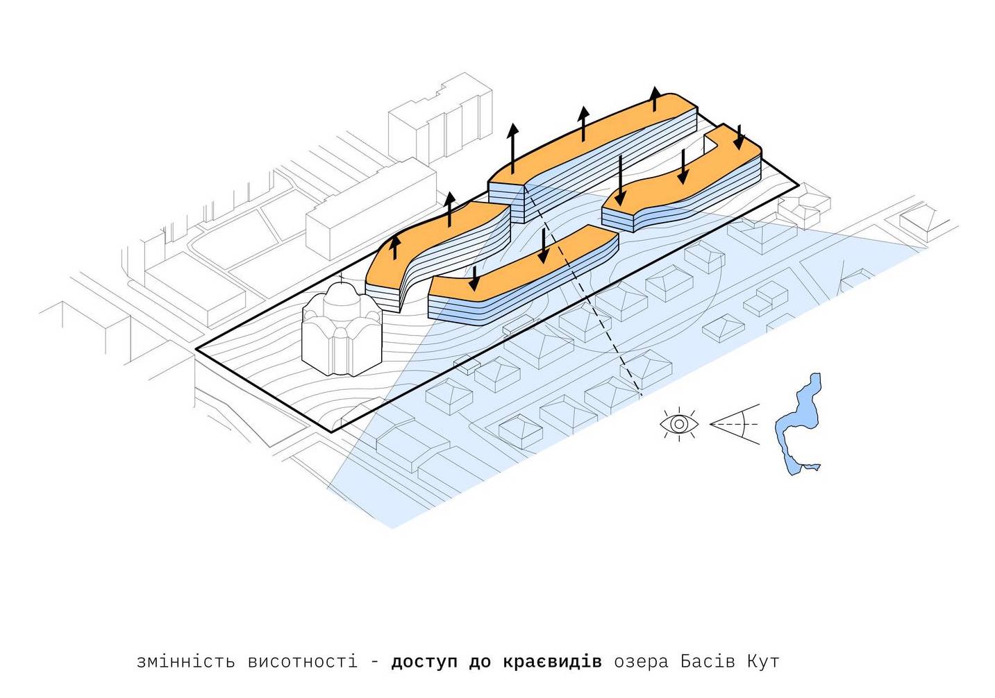 Висотність житлових будинків варіюється, щоб забезпечити види на озеро Басів Кут. Будівлі матимуть зелені дахи, приватні та спільні тераси, палісадники та балкони з боку двору.
