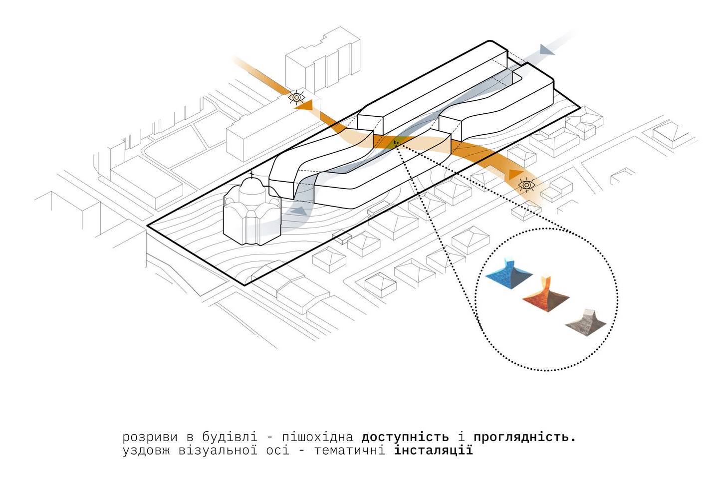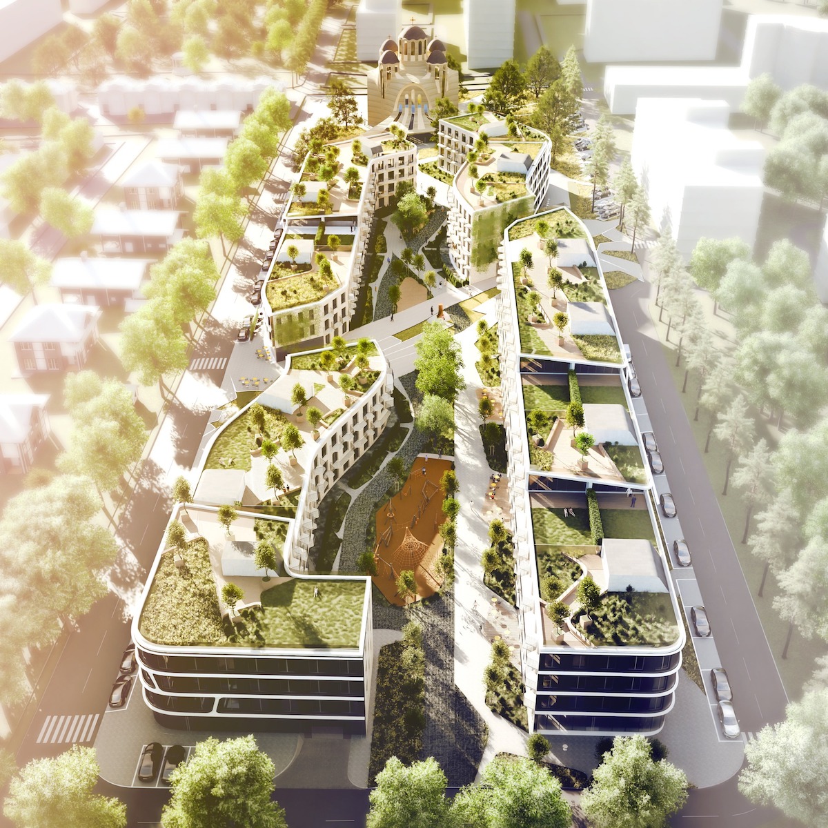 Храм оточуватиме громадський простір. Також публічні простори передбачено у вгинах кварталу й у дворі. Двір — без автомобілів.
