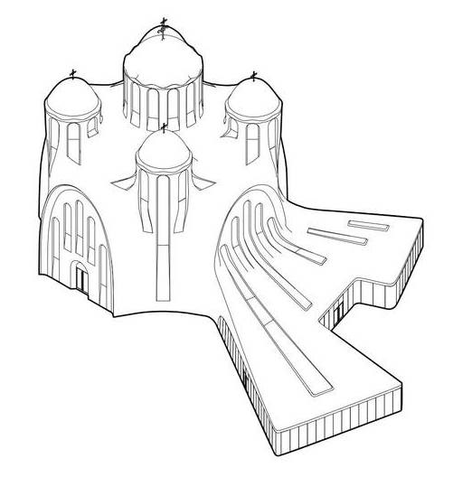 У проєкті будівлі собору Aranchii Architects об’єднали візантійську традицію з сучасною технологією 3D-друку. В собор буде інтегровано недільну школу та бібліотеку.