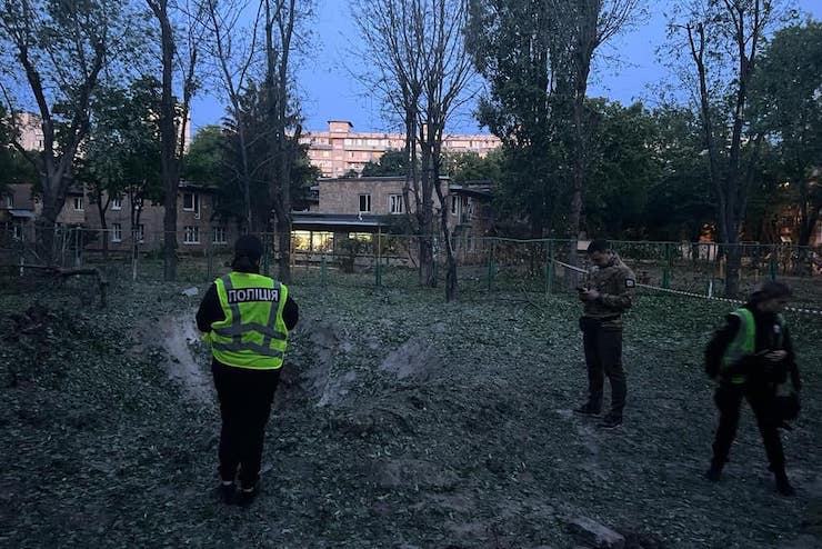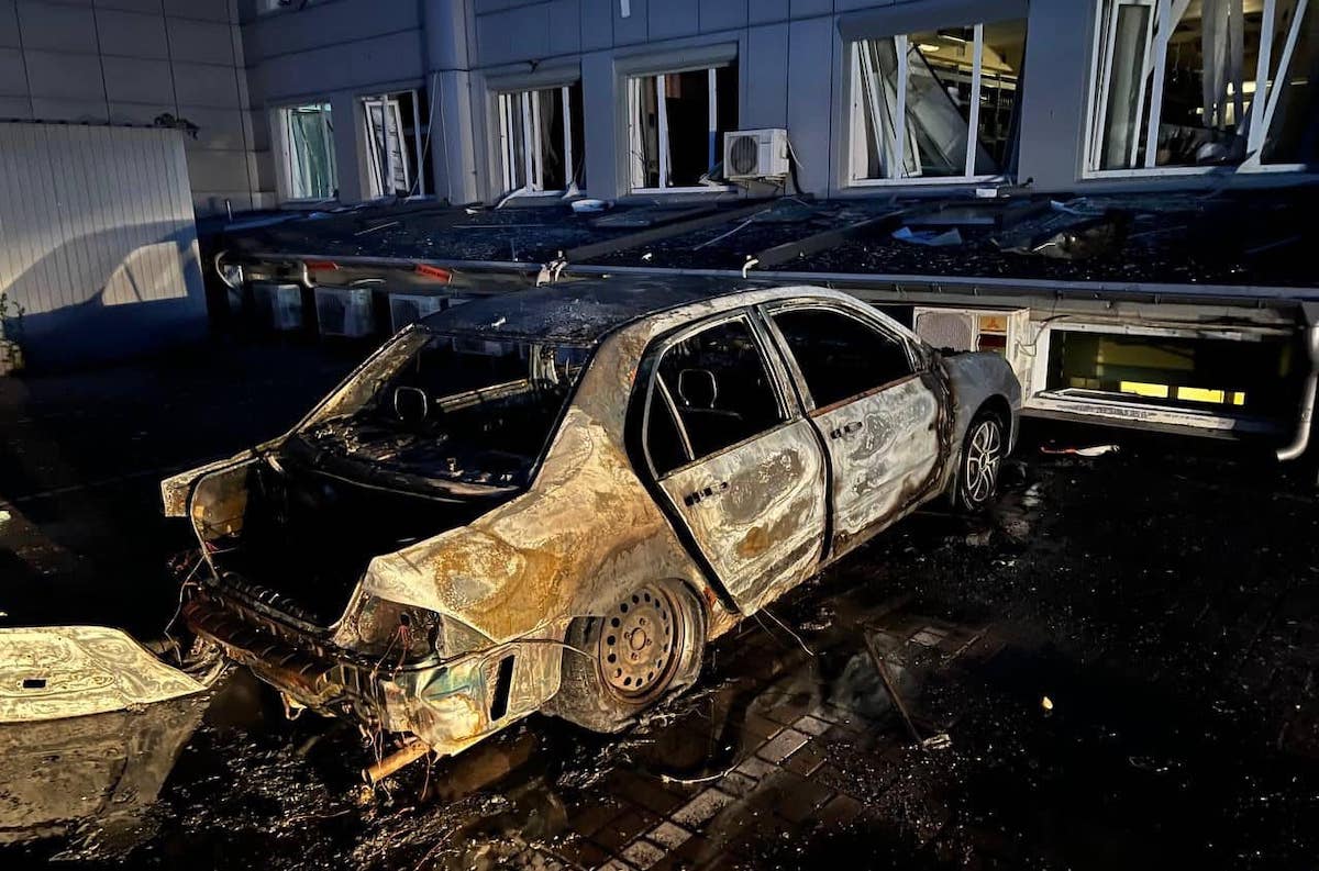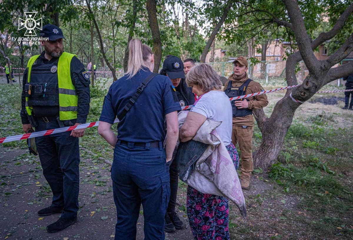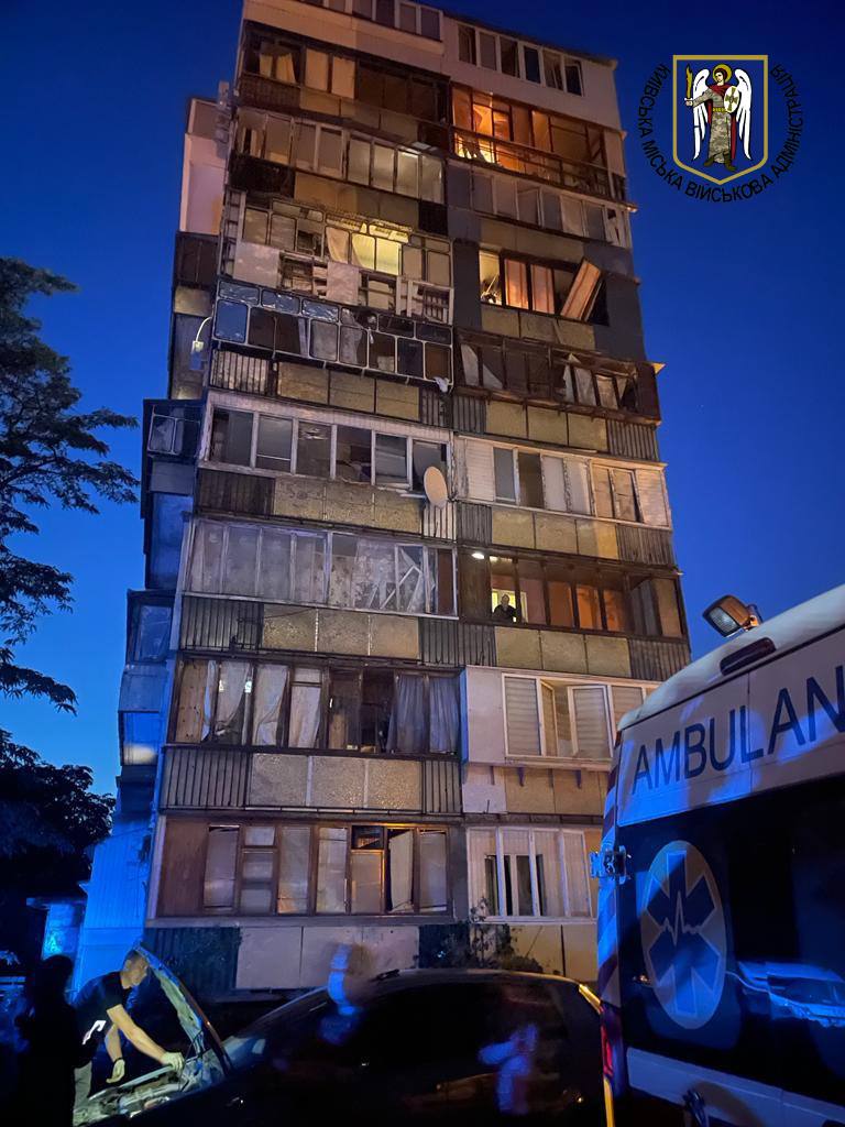 Ще двоє людей постраждало у Дніпровському районі. У житловому будинку вибило вікна, пошкоджено недіючий п’ятиповерховий офіс, у дворі якого згорів автомобіль, уламки впали у дворах, на проїжджій частині, на зелених зонах.