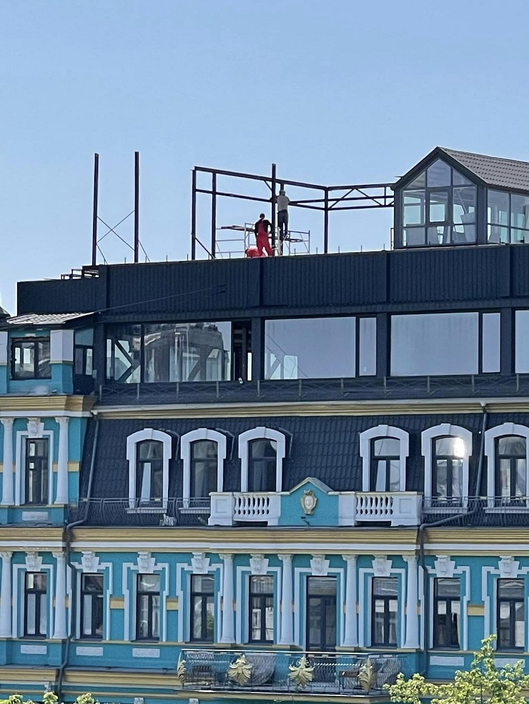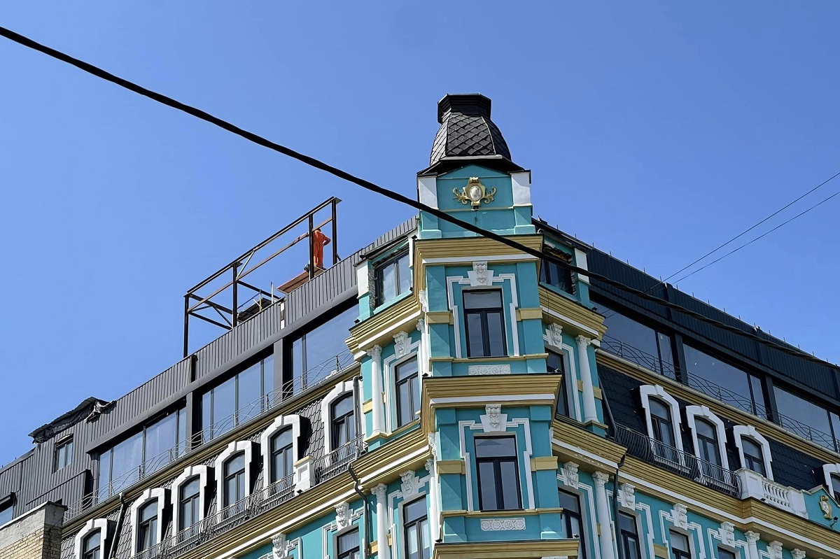 У будинку на вулиці Володимирська, 4 у центрі Києва будують другий мансардний поверх. Містянка Оксана Левченя стверджує, що будівельники не припиняють роботу навіть під час повітряної тривоги.