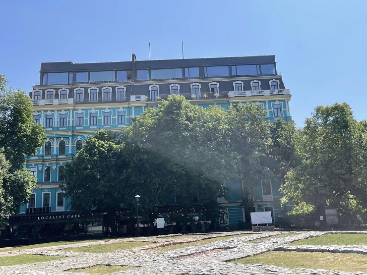 Поруч з будинком знаходяться Михайлівський золотоверхий монастир, маєток князів Трубецьких, музеї, пам’ятники та старовинні будівлі, парк «Пейзажна алея». З вікон тепер вже офісного комплексу відкриваються види на Андріївську церкву та Дніпро.