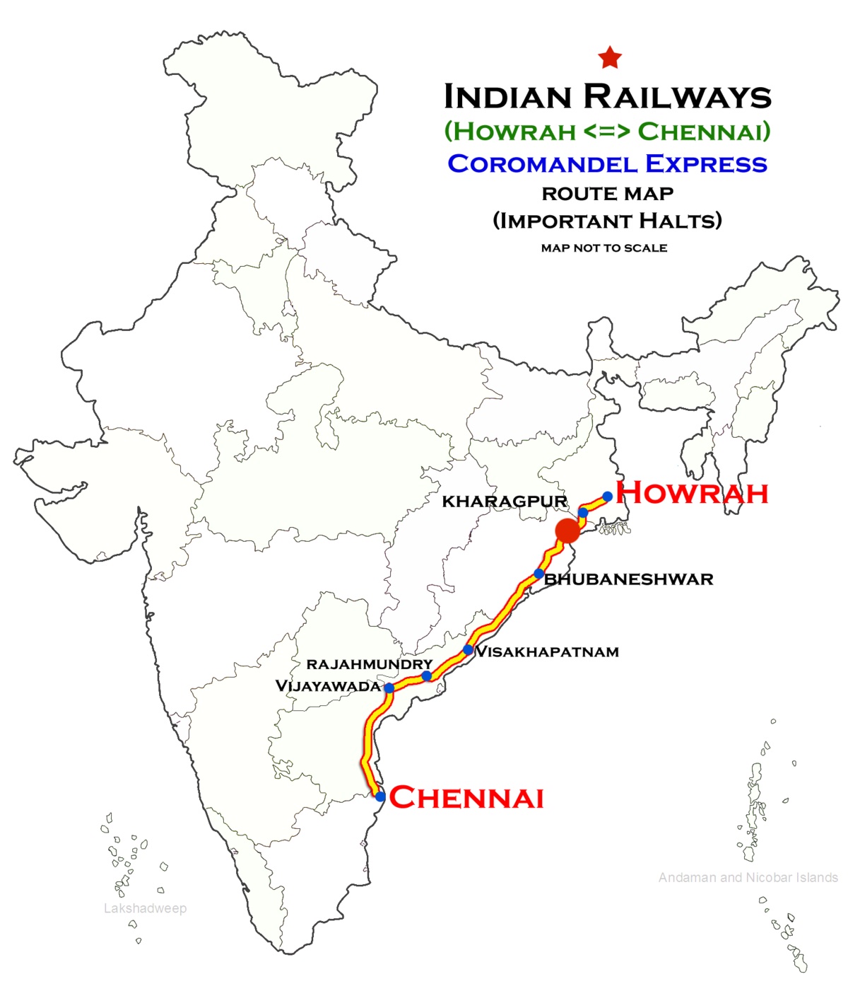 Маршрут Коромандельського експреса. Червоною крапкою позначено місце катастрофи