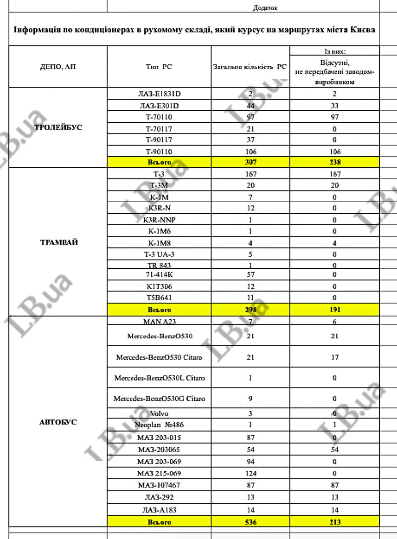 Найменше кондиціонерів — у тролейбусах: тільки 69 одиниць із 307 (22,5%) обладнані охолоджувачами повітря. У 107 трамваїв із 298 (36%) встановлено кондиціонери. 323 із 536 (60%) автобусів мають кондиціонування.