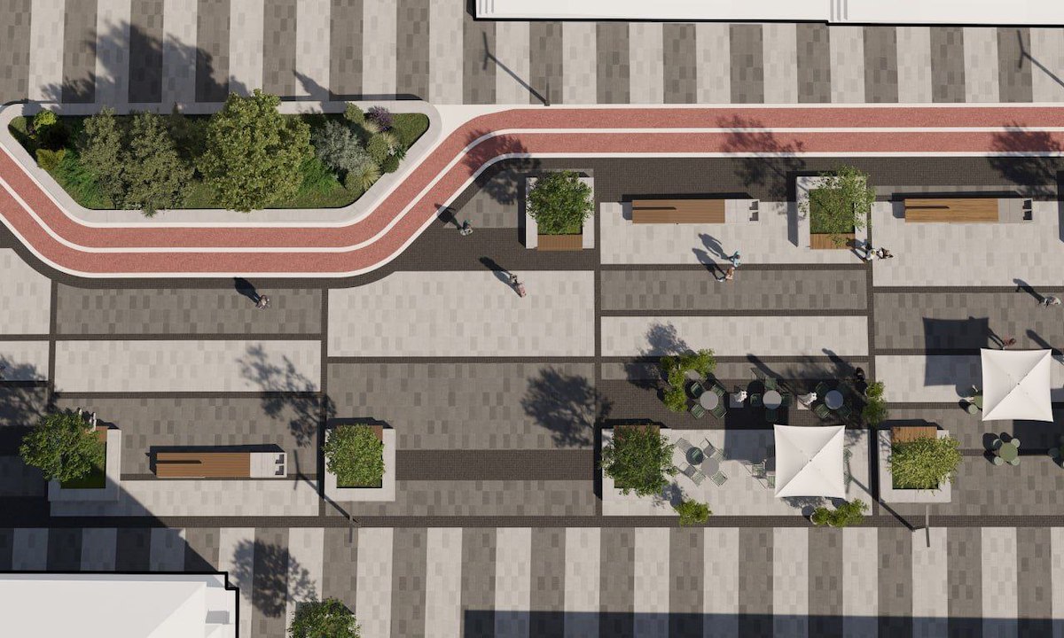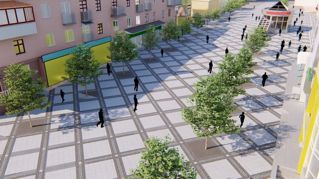 По центру вулиці зберігаються фрагменти бруківки, решта вкрито світло-сірим та темно-сірим «фемом». Вздовж звивається велодоріжка. Значну частину простору займають торговельні ятки. Як зазначає читач «Хмарочоса» @brutalazy, буквально через дорогу вже є продуктовий базар. Передбачено зробити одноповерхову прибудову будинку №16.