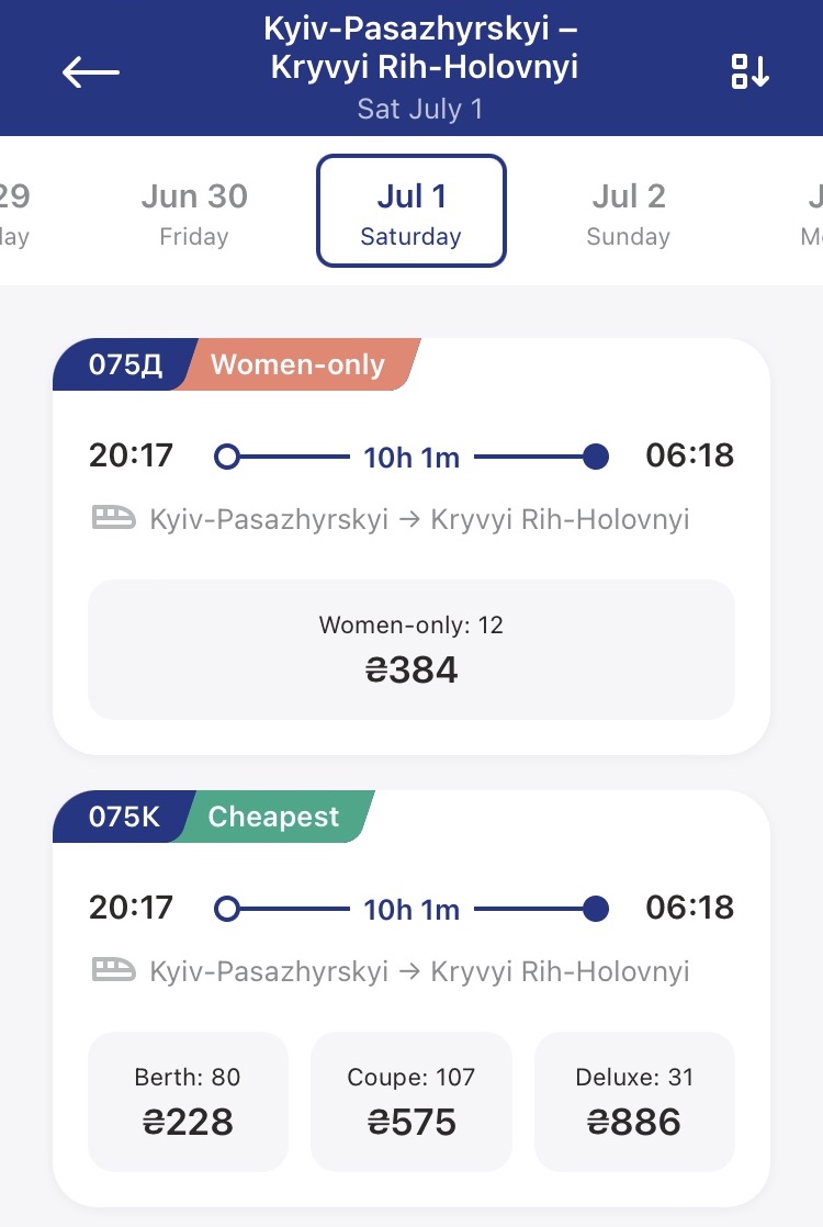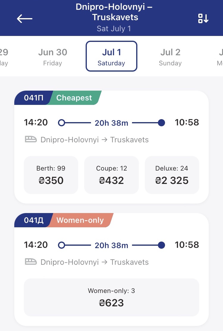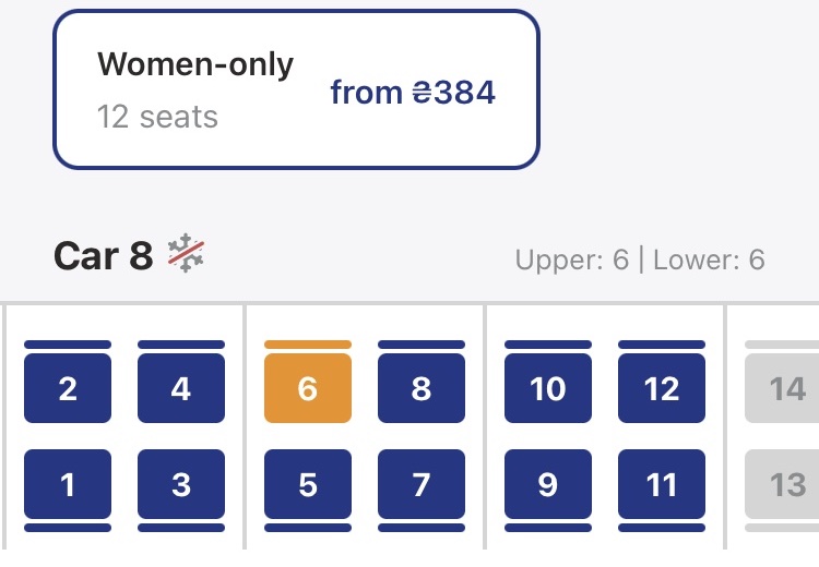 «Хмарочос» знайшов квитки в жіночі купе на два останні потяги. У таких купе жінки можуть подорожувати разом із дітьми до шести років.