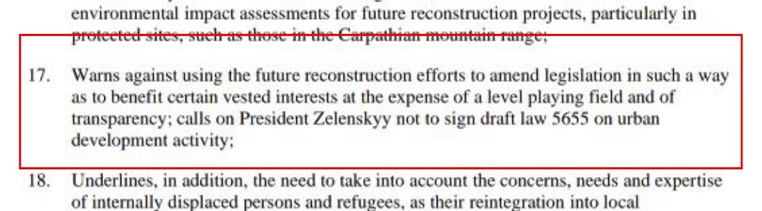 Так, у пункті 17 сказано: «Закликаємо президента Зеленського не підписувати проєкт №5655 про містобудівну діяльність».