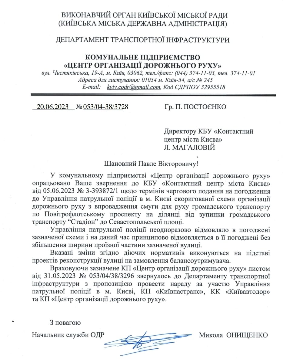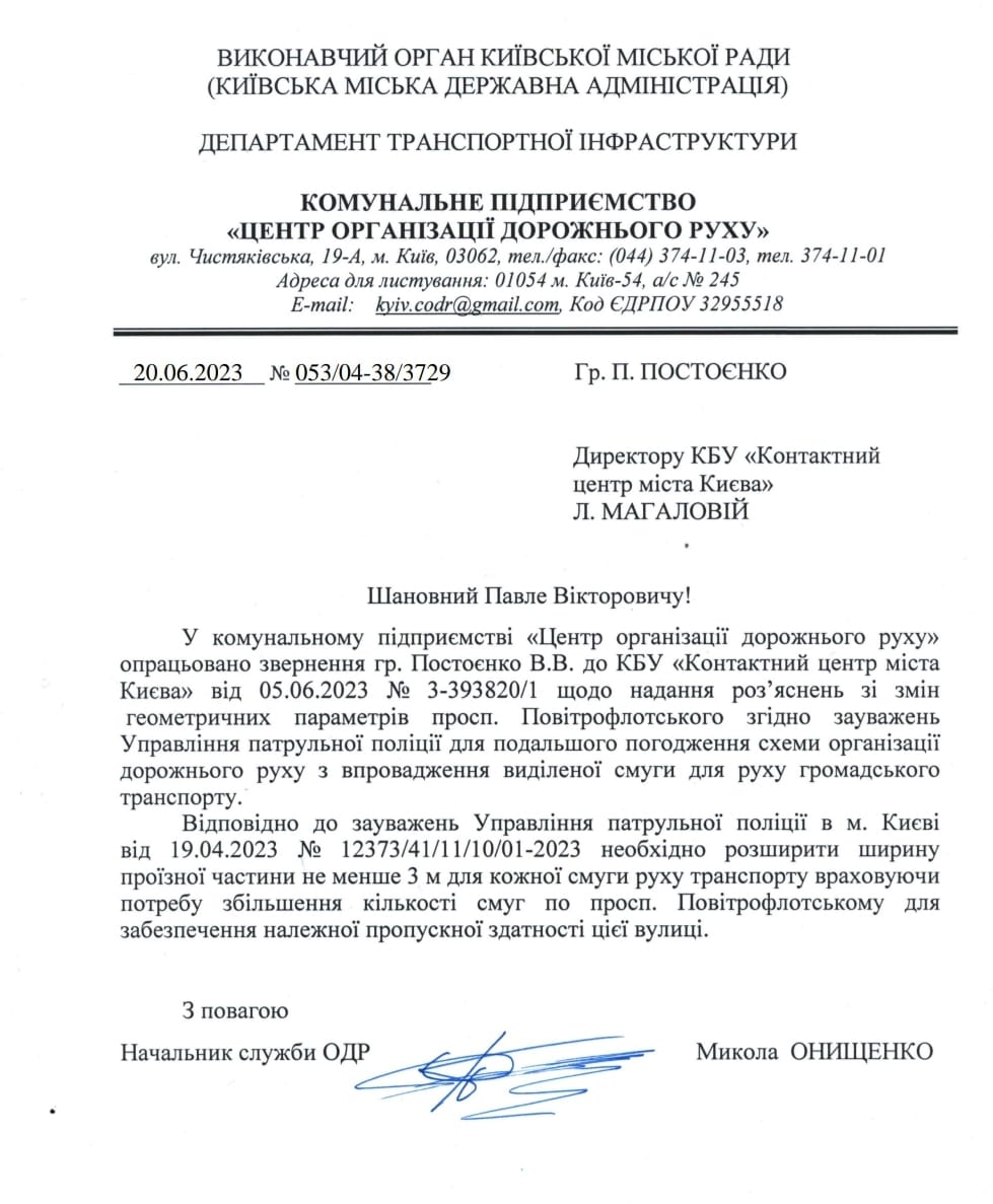 Патрульна поліція Києва виступає проти створення смуг громадського транспорту на Повітрофлотському проспекті, мовляв, треба розширювати дорогу. Про це йдеться у відповіді Центру організації дорожнього руху на запит киянина Павла Постоєнка.