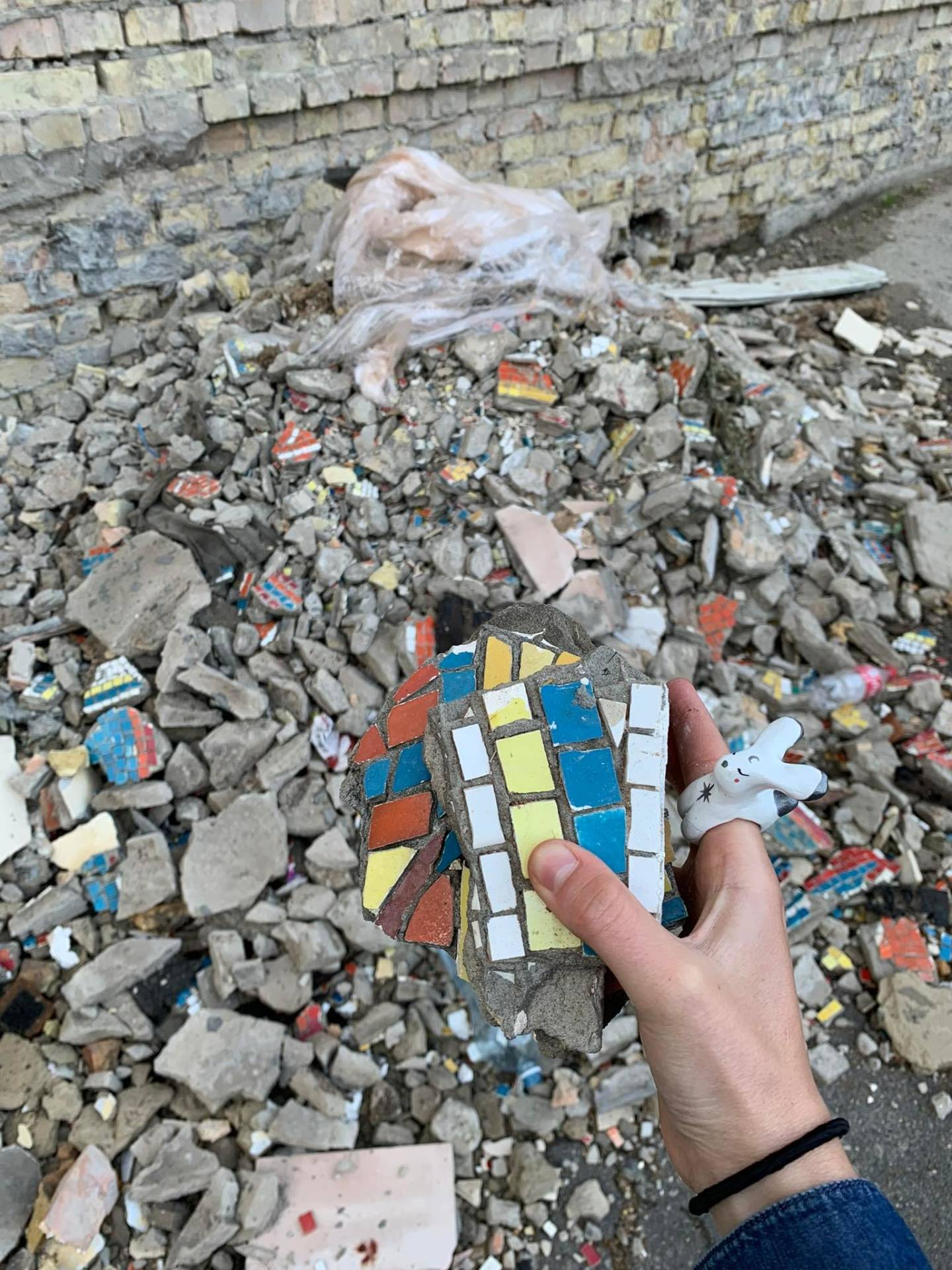 Мозаїчне панно, яке зображувало боротьбу пожежників із вогнем, розміщувалася на стіні всередині павільйону. Світлини уламків збитої мозаїки було зроблено днями.