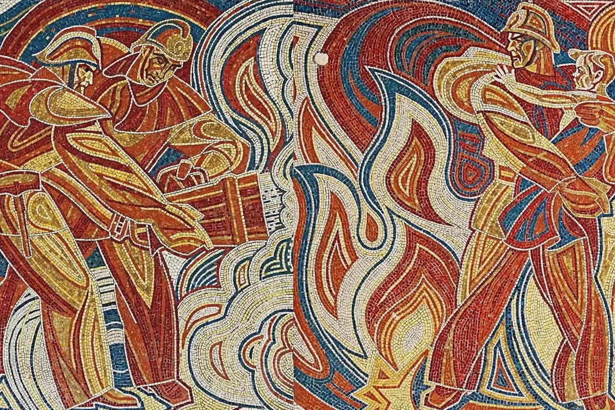 Мозаїчне панно, яке зображувало боротьбу пожежників із вогнем, розміщувалася на стіні всередині павільйону.
