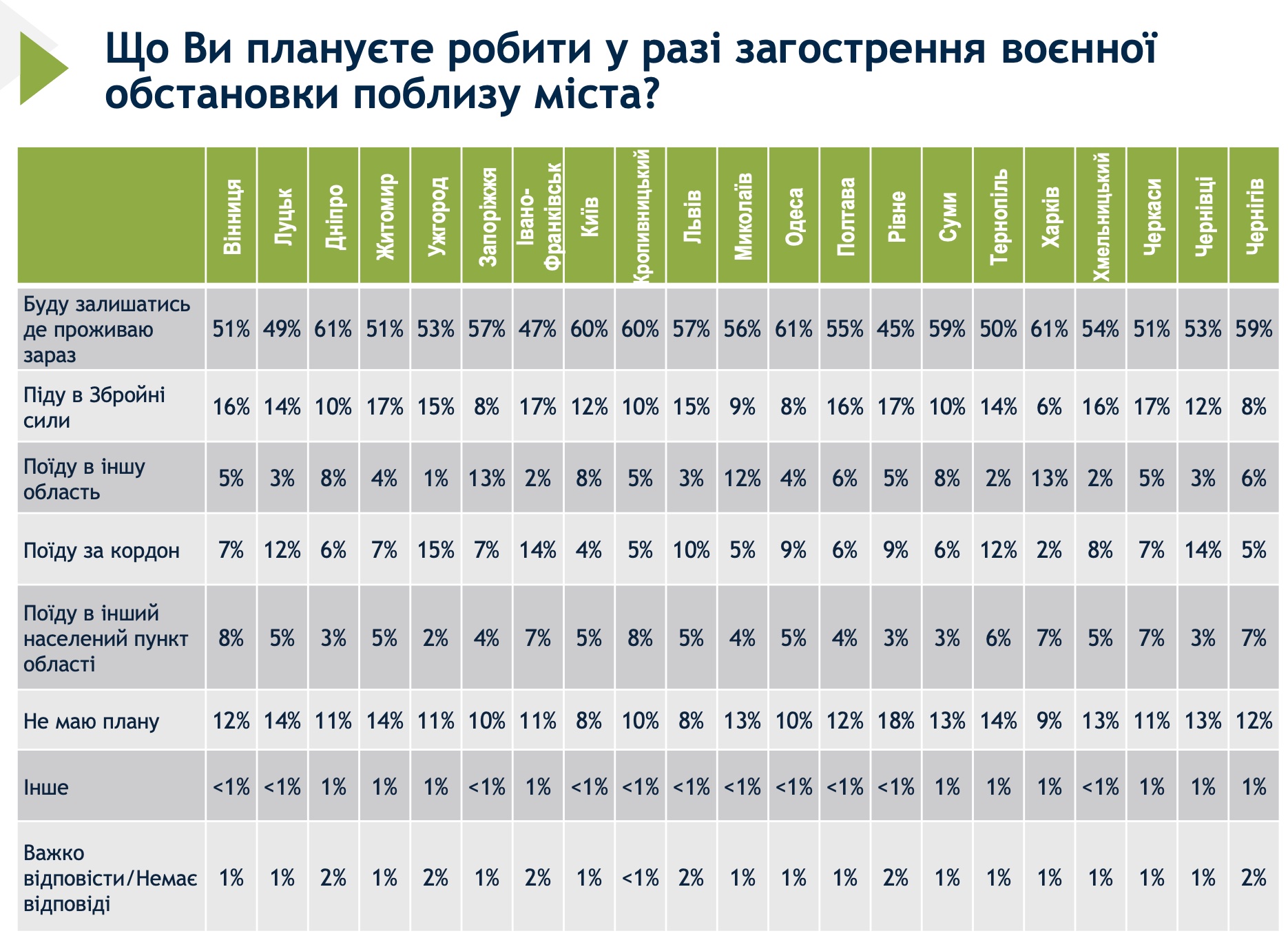 У середньому 90% не збираються переїжджати зі свого міста після війни. Так, 93% киян хочуть лишатися в Києві. Найнижчий відсоток (87-88%) — серед мешканців Запоріжжя, Миколаєва, Чернівців та Ужгорода.