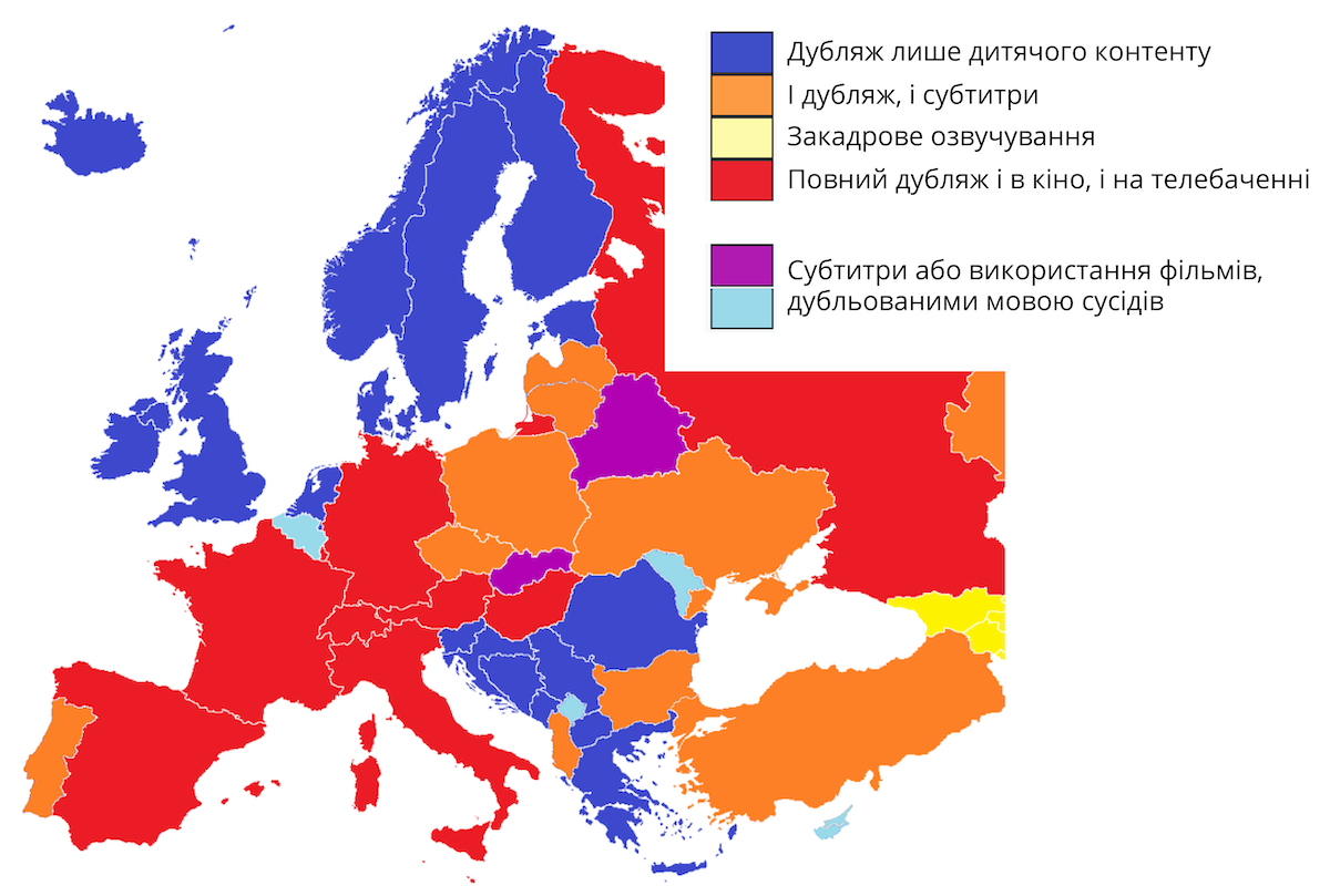 У Франції дубляж є повсюдним, як в кінотеатрах, так і на телебаченні. Виключення становлять незалежні стрічки для нішевої аудиторії. Так само — в Іспанії, де фільми та телеконтент дублюються європейською іспанською, або мовами регіонів: каталонською, баскською тощо.
