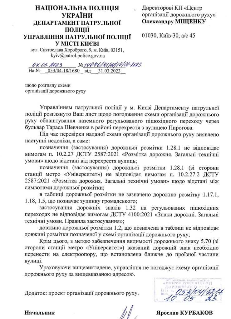 Розробників наземного регульованого переходу до станції метро «Університет» в Києві просять зробити правильну розмітку та знаки, щоб поліція погодила схему організації дорожнього руху. Про це йдеться у відповіді на запит киянина Павла Постоєнка.