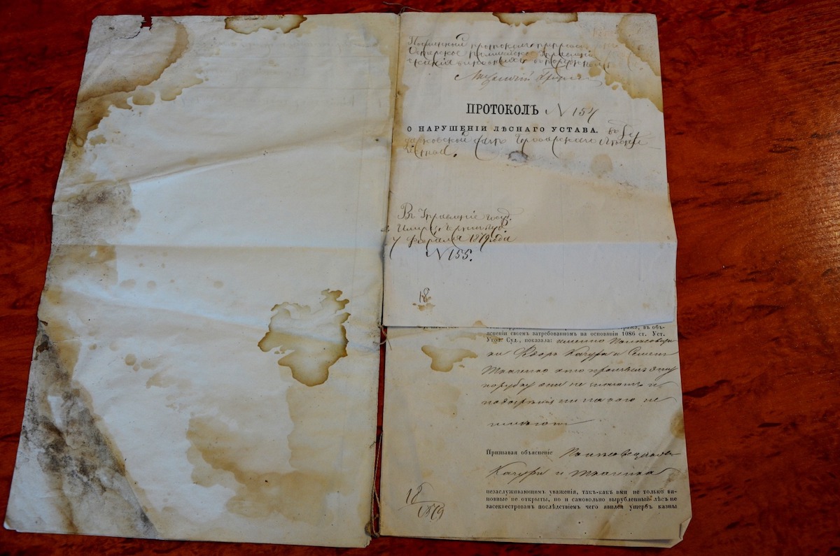 Наприклад, «Протокол про лесонарушение», складений 1879 року: хтось вкрав «казенні» дерева з лісу, винного не знайшли, і сплатити штраф змусили лісника.